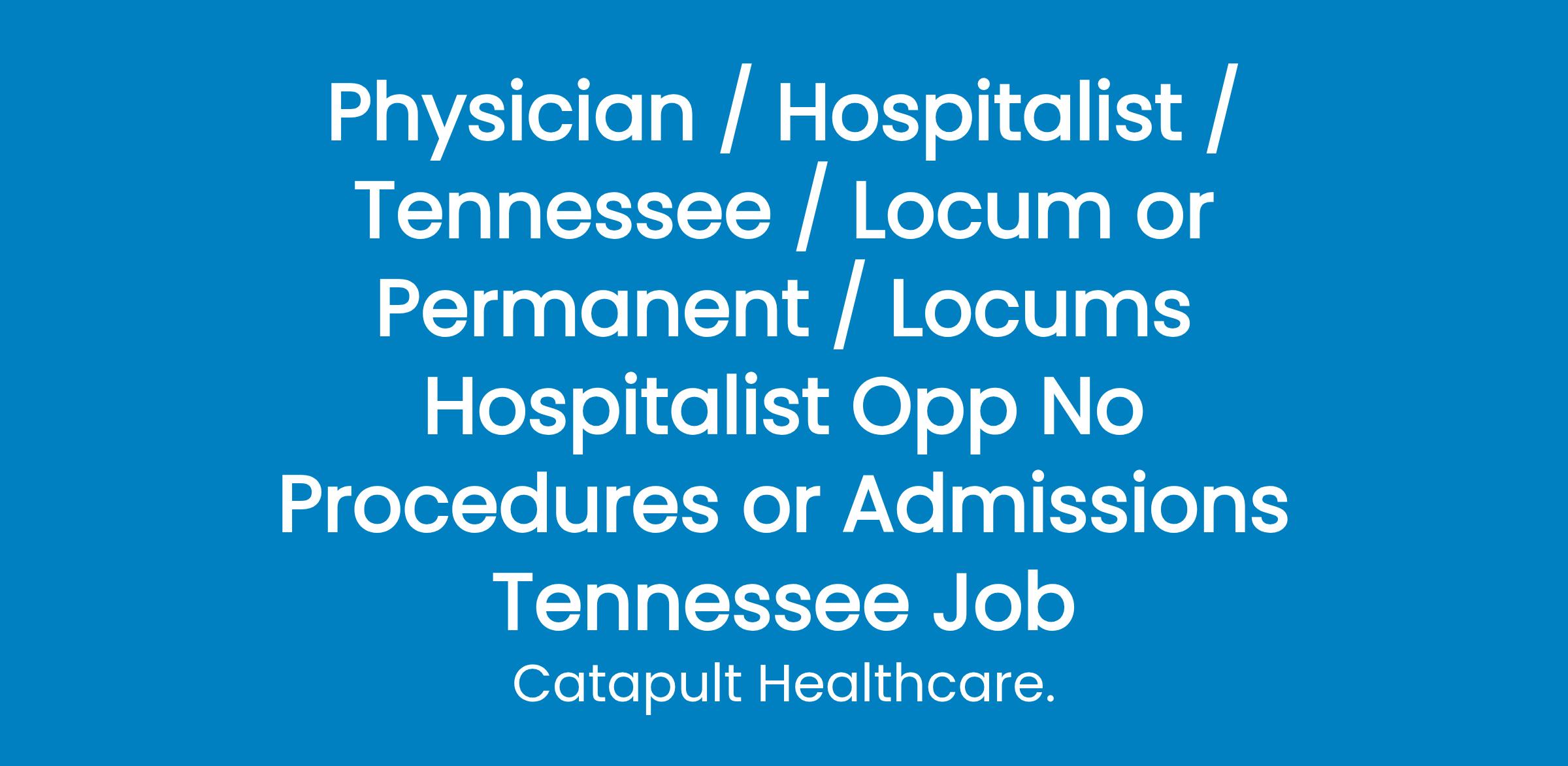 Catapult Physician Staffing is currently partnered with a health system that manages 7 community hospitals in NE Tennessee and Virginia and they have an URGENT need for a Locums Hospitalist for their Kingsport, TN location. They have the ability to grant temporary privileges and are willing to consider candidates with full time or part time shift availability. I came across your profile and thought you would be interested in hearing about this opportunity. Here are some additional details about the role:-7on/7 off Schedule, shift time is 8am 8pm-Nurse Practitioner works in the ED doing Admissions-Open ICU and Hospitalists are expected to work in the ICU-Facility has a code team that responds to all codes-The ability to do procedures is helpful, but not required-18-22 patients per day-EMR system is Epic-Facility is open to Locums, Locums to Permanent, or Permanent Placement for all providersJob Benefits:-Travel and Lodging Covered-"Try before you buy" opportunities-Free MalpracticePlease call Kendyl Ford at to discuss this opportunity further, or email confidential CV's to