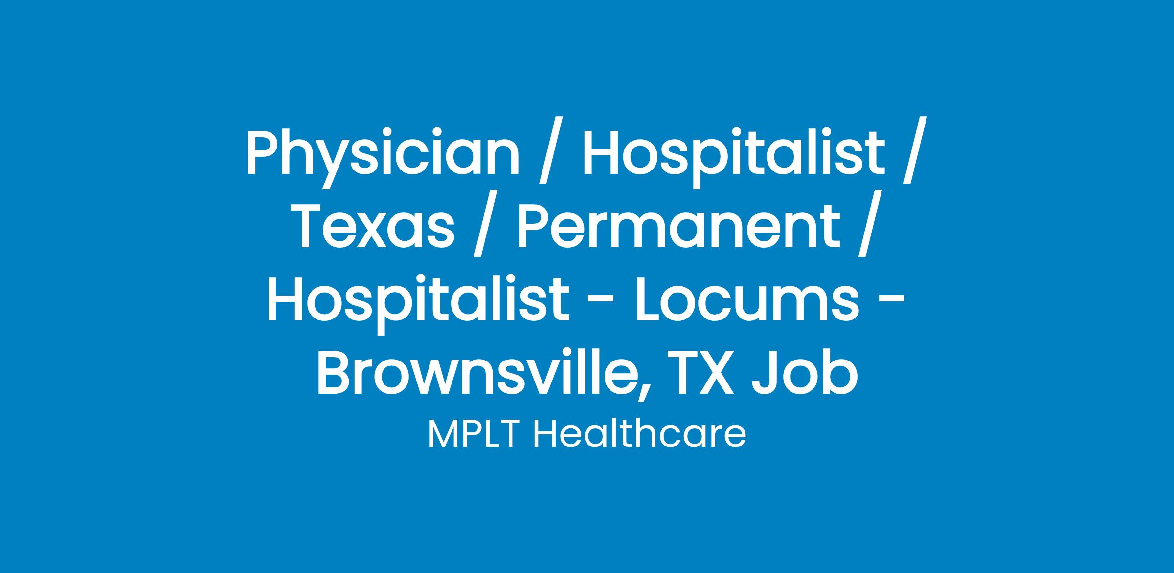 MPLT Healthcare is looking for physicians who Understand the Urgency, Never Give Up, and Have the Courage to Excel in the forever changing medical industry! We have numerous opportunities for an experienced Hospitalist w ith highly competitive pay rates in Brownsville, TX.