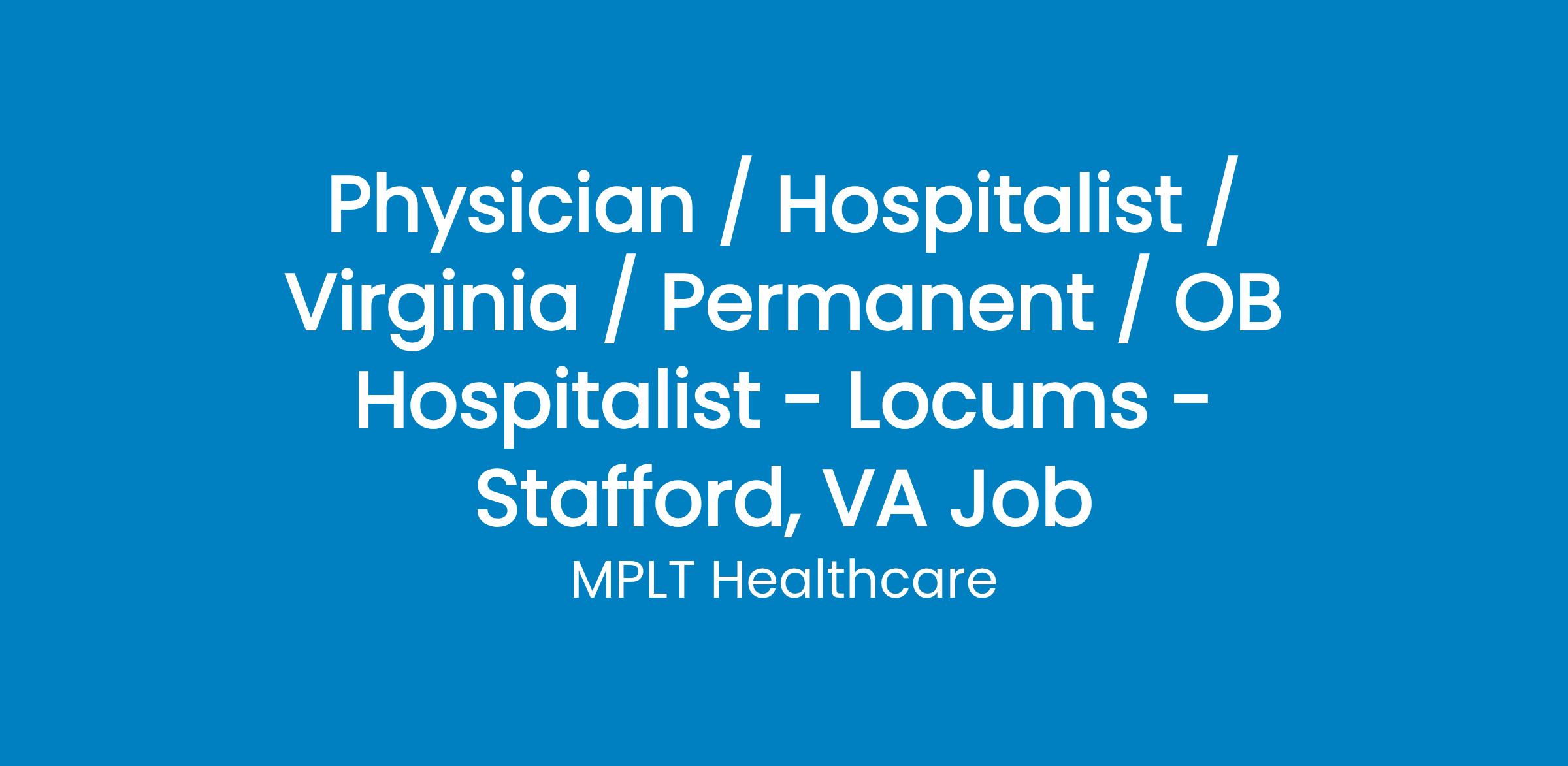 MPLT Healthcare is looking for physicians who Understand the Urgency, Never Give Up, and Have the Courage to Excel in the forever changing medical industry! We have numerous opportunities for an experienced OB Hospitalist with highly competitive pay rates in Stafford, VA.