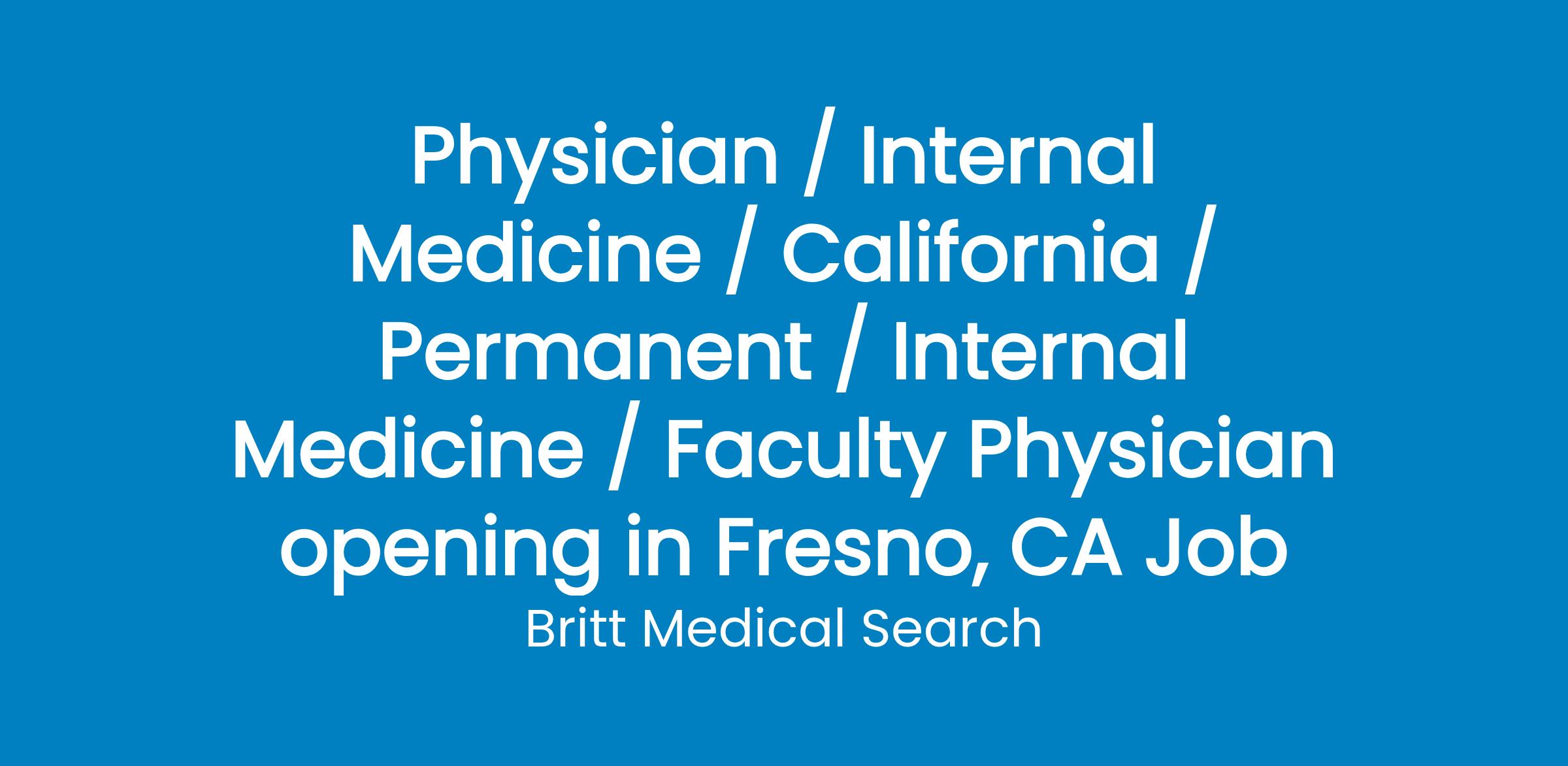Seeking BE/BC Internal Medicine Physician to join group with 30+ health center locations in the central valley. This position will see patients in outpatient only practice in both a teaching and non-teaching environment.