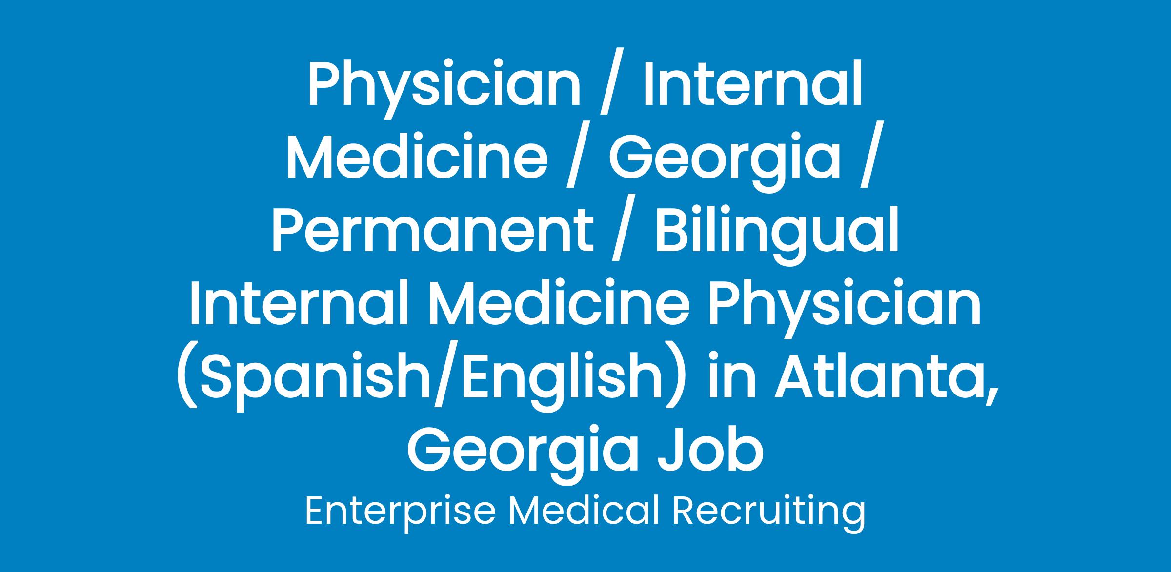 Seeking a Bilingual (Spanish/English) Internal Medicine physician to join a growing outpatient practice in the Greater Atlanta, Georgia area. The Team Physician will work closely with the Care Team Medical Director to play a critical role in both care delivery and ongoing practice innovation.