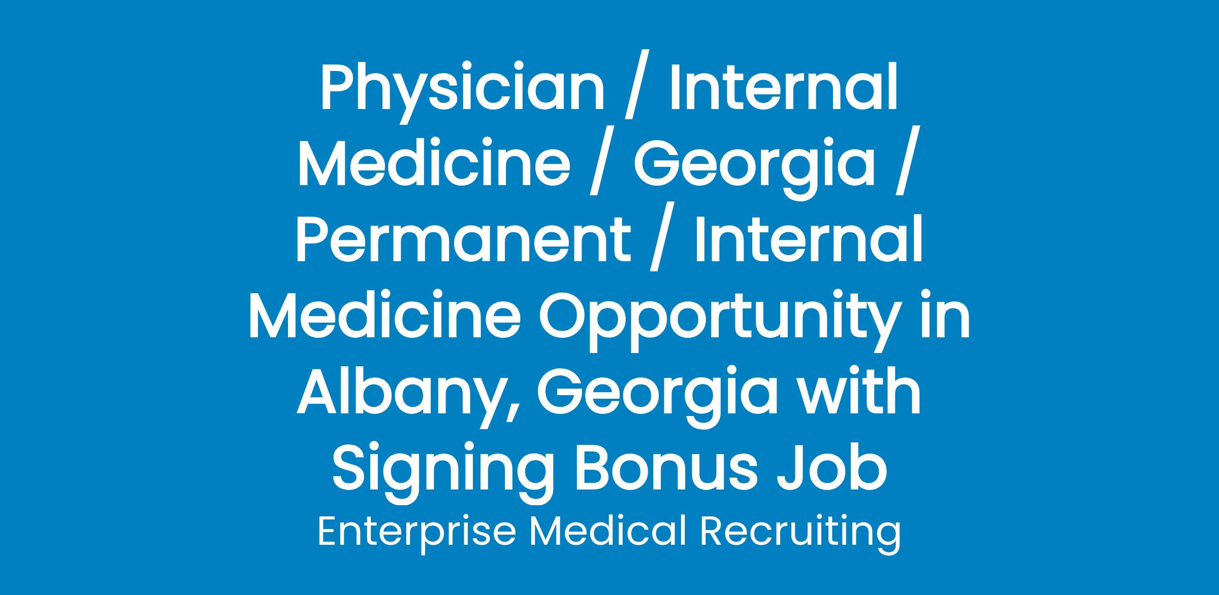Partnered with Enterprise Medical, this leading health system serves more than 500,000 residents across Southwest Georgia with over 300 providers. They are currently seeking an Internal Medicine physician to join their busy, well-established practice.