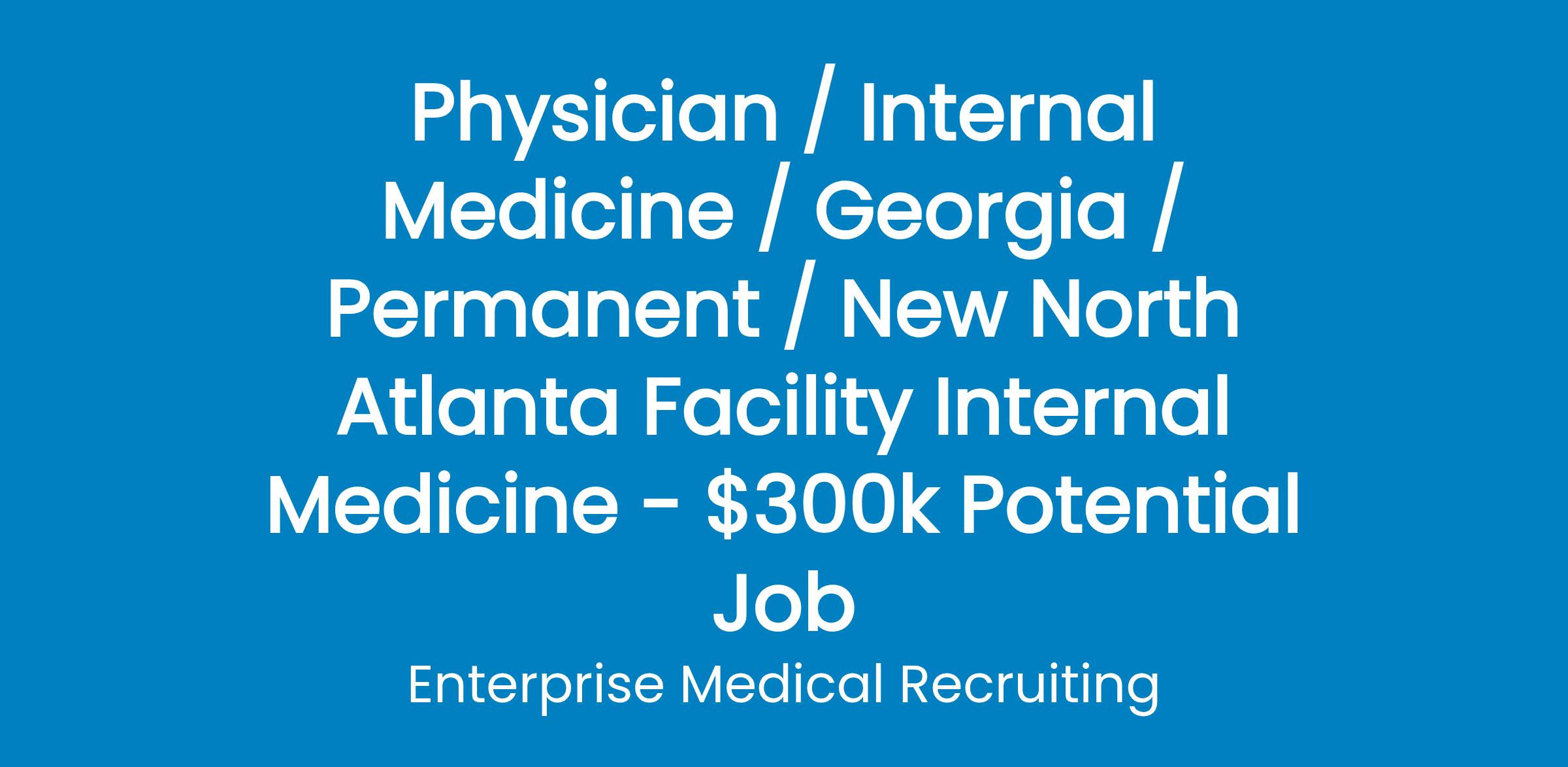Enterprise Medical is representing a prominent physician-owned and operated group practice with five offices in the greater Atlanta area. The group has an opening for an internal medicine physician in Braselton, GA.