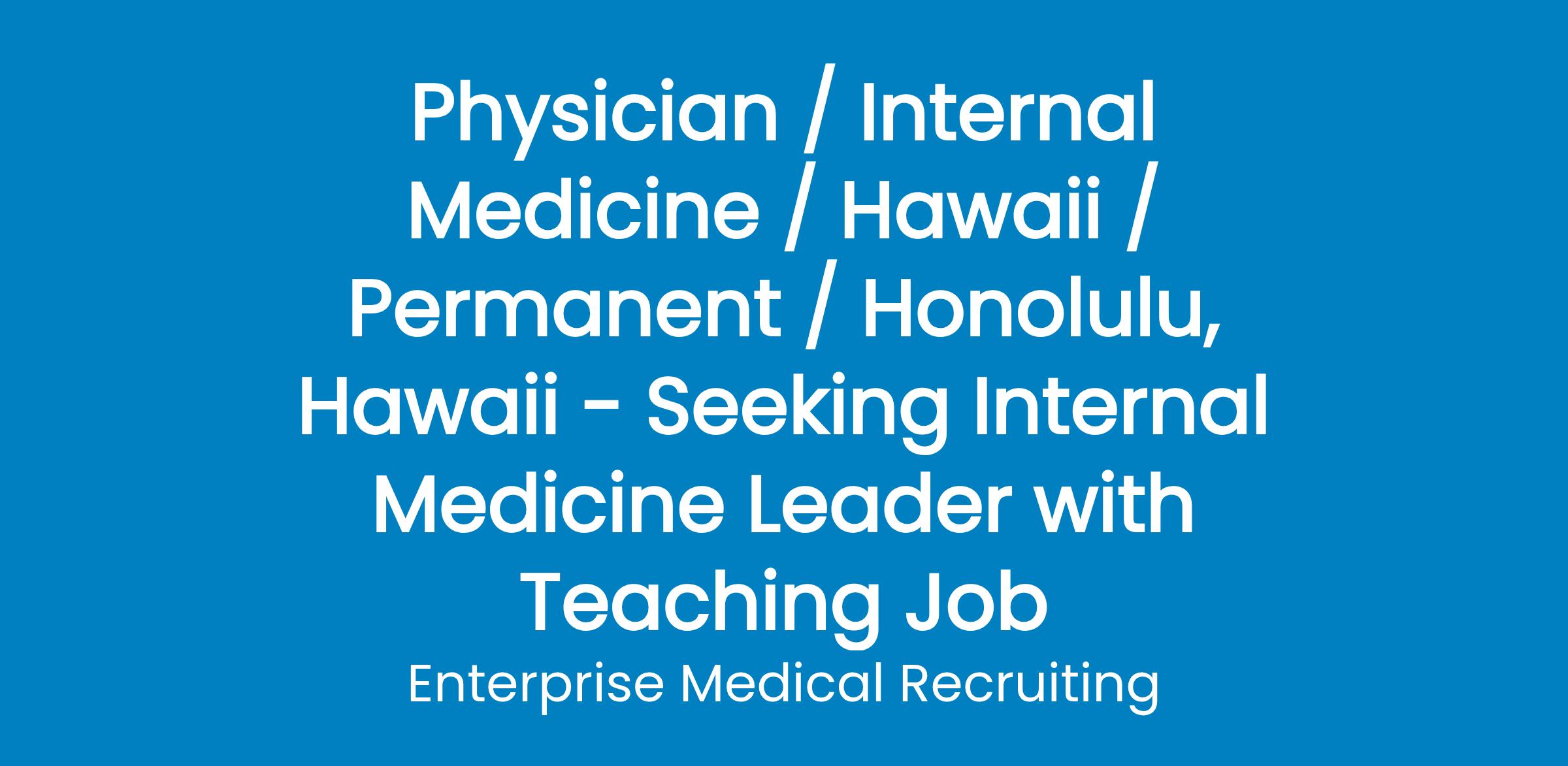 Enterprise Medical represents a Federal Qualified Community Health Center located in the heart of Honolulu, Hawaii. We are interviewing internal medicine physicians with an interest in leadership and teaching