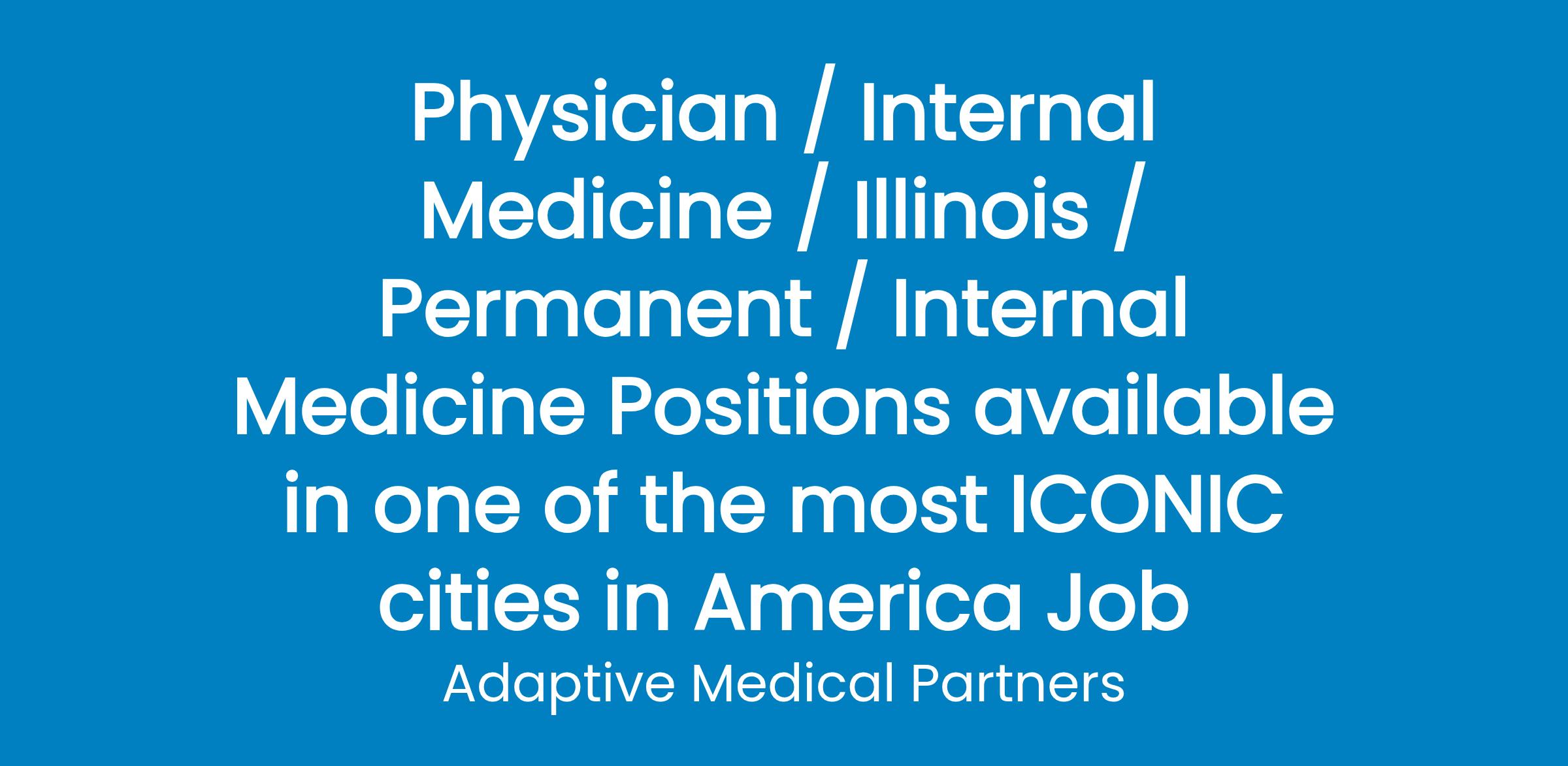 Award-Winning Primary Care Group Looking to Grow with a Brand-New Location!Ranked Top 2% in the Nation for Quality!Join our rapidly growing, forward-thinking organization that emphasizes a culture of collaboration and team dynamics. We serve our patients based on our core values and passion for providing quality care. This is just an example of the type of options for Internal Medicine practices we are representing here at Adaptive Medical. This well-known metropolitan is home to millions as an international hub for culture, finance, culinary experience, and technology. We have incredible education options, World-Class universities and colleges, and an international airport. There are limitless options for fun, exploration, and adventure!The financial package is as follows:Competitive compensation package Incentive bonusQuality bonusRelocation assistancePTO- 26 days plus 10 holidaysCME- 5 days + stipendStudent Loan RepaymentStandard health and welfare benefits, including matching retirementThere is so much more about this opportunity that you will want to learn. Please contact Scott Yeang for more information at , via email at and reference job number 1139.