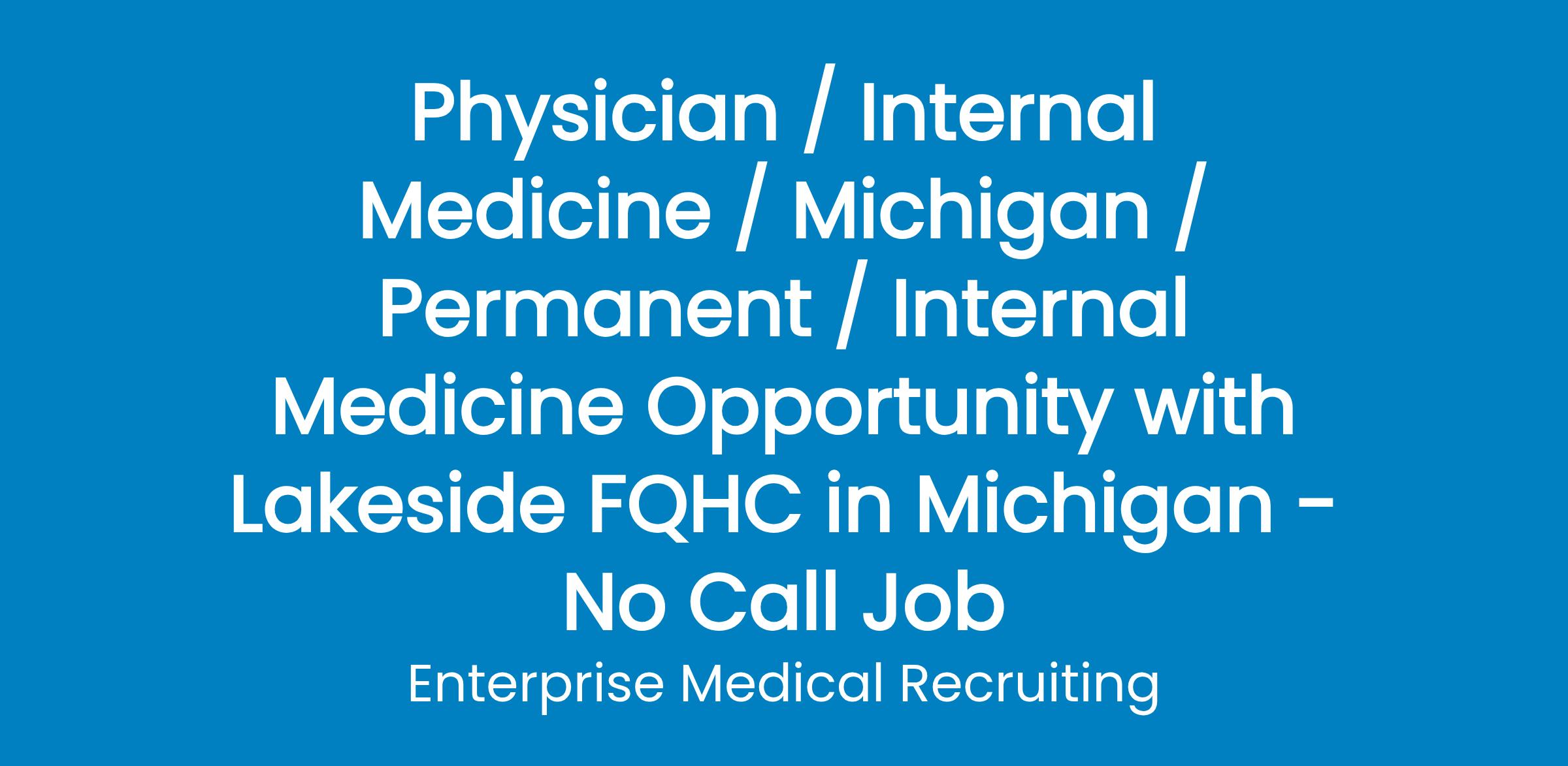 Enterprise Medical is partnering with a University of Michigan-affiliated FQHC in Houghton Lake, Michigan to add a primary care physician to their thriving team. This opportunity offers a rewarding blend of meaningful patient care, strong clinical support, and the lifestyle benefits of a lakeside community.