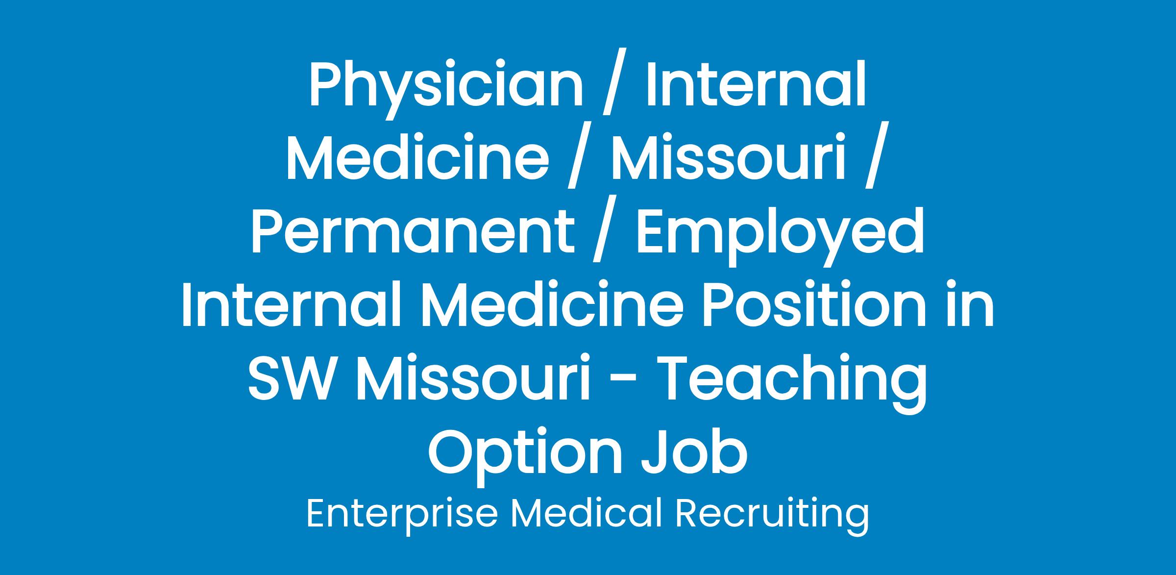 Join a friendly, well-established, and family-oriented primary care group in Joplin, Missouri. The group wants to add a BC/BE Internal Medicine physician.
