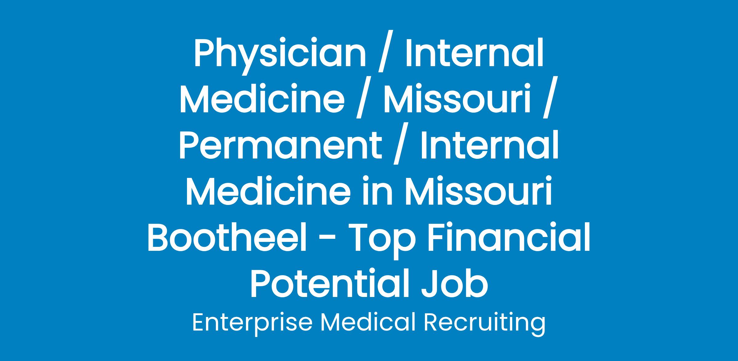 Interviewing Internal Medicine physicians to join a private group with 2 primary care physicians and 10 advanced practice providers in the Missouri bootheel area. Group has 6 clinics and offers primary care, hospitalist, wound care, and pain management services. The group is a perfect fit for the go-getter that wants to work hard, do well financially, and make a difference in an underserved community.