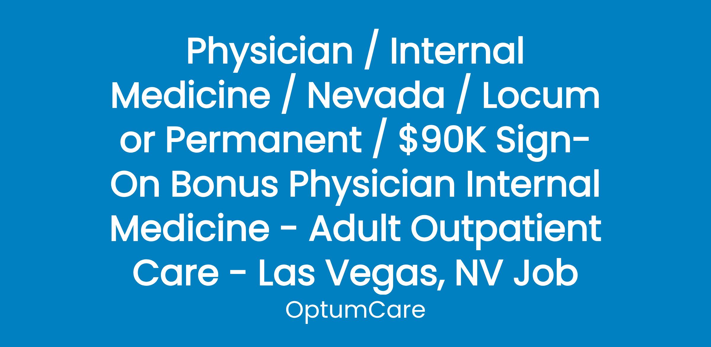 In this position you will work with other physicians in teams but manage your own panel of patients Monday-Friday. The patient population is an adult panel of all ages including geriatrics and some older adolescents and can be customized for interest areas. Our seniors have the convenience of our new Lifestyle Centers. Work in attractive/modern buildings and enjoy an electronic medical record environment. Full time management staff, digital radiology and onsite laboratory services add conveniences at our 14 clinic locations throughout the Las Vegas area. Physicians in this function require specific education/licensure/board certification and practice as a provider in a clinic or hospital setting.