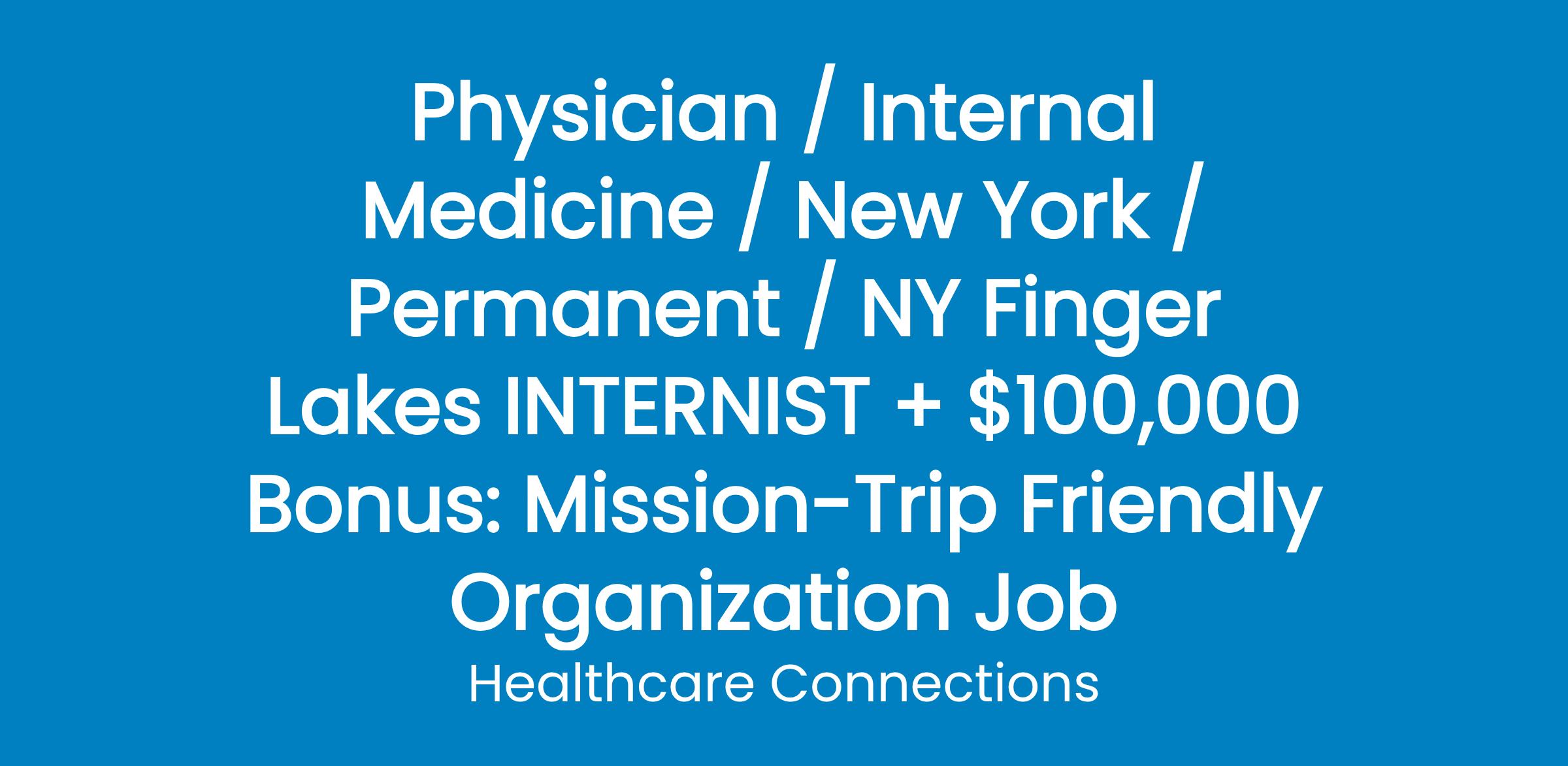 NY Finger Lakes INTERNIST + $100k Bonus: Mission Trip Friendly Organization
