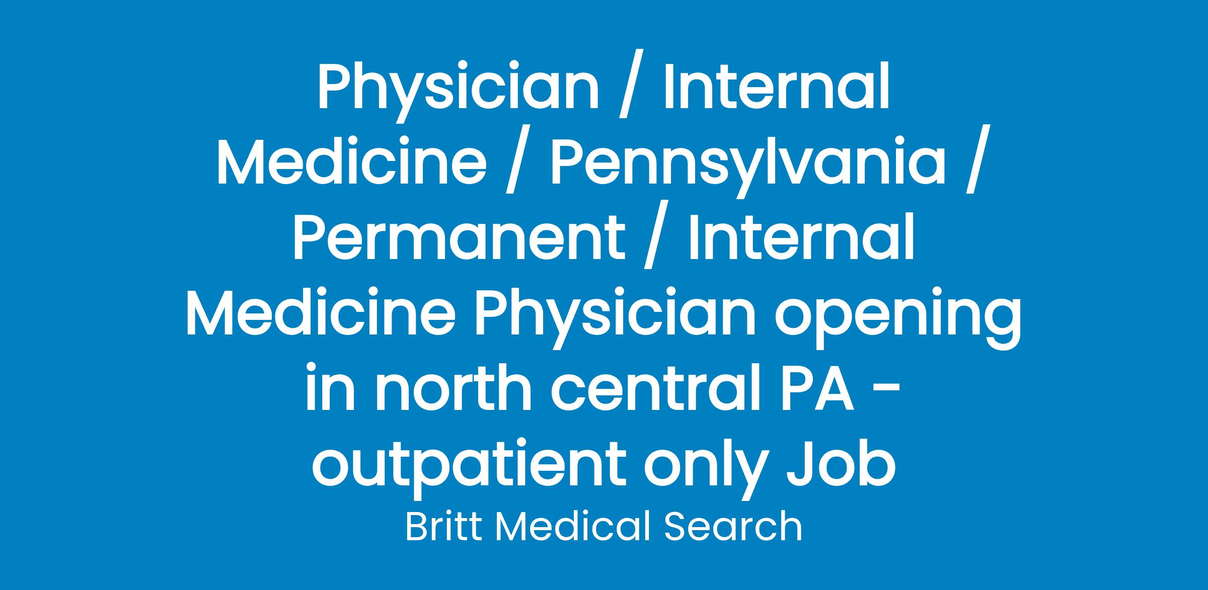 Regional healthcare leader is seeking a full-time BC/BE Internal Medicine Physician to join a well-established practice in north central PA.