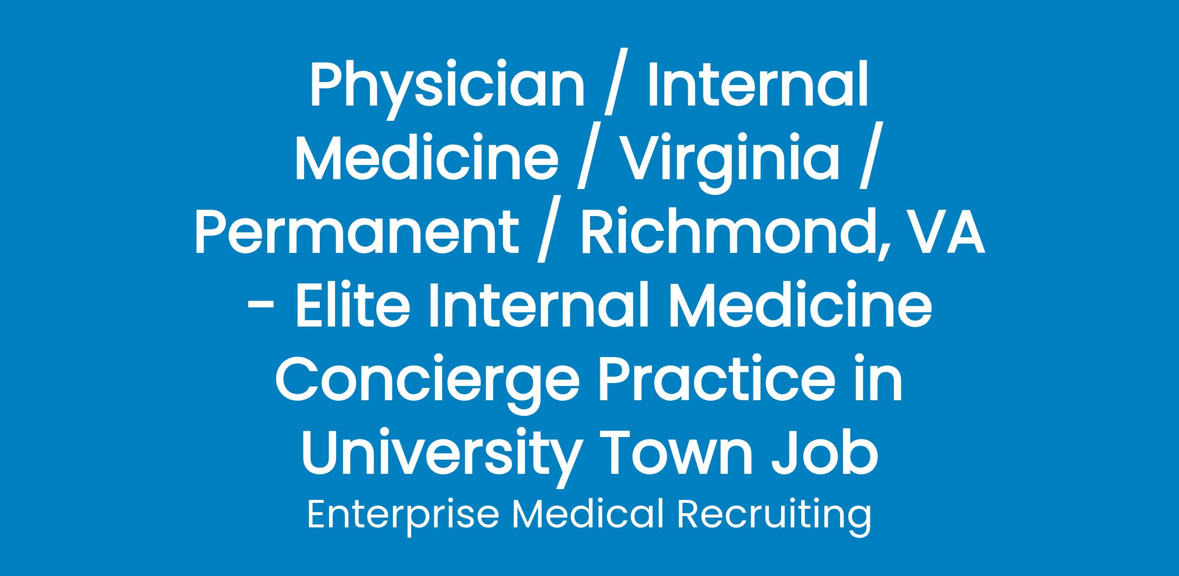 Enterprise Medical is assisting a prominent concierge group in Richmond, Virginia, home of Virginia Commonwealth University. We are scheduling interviews for Internal Medicine physicians.