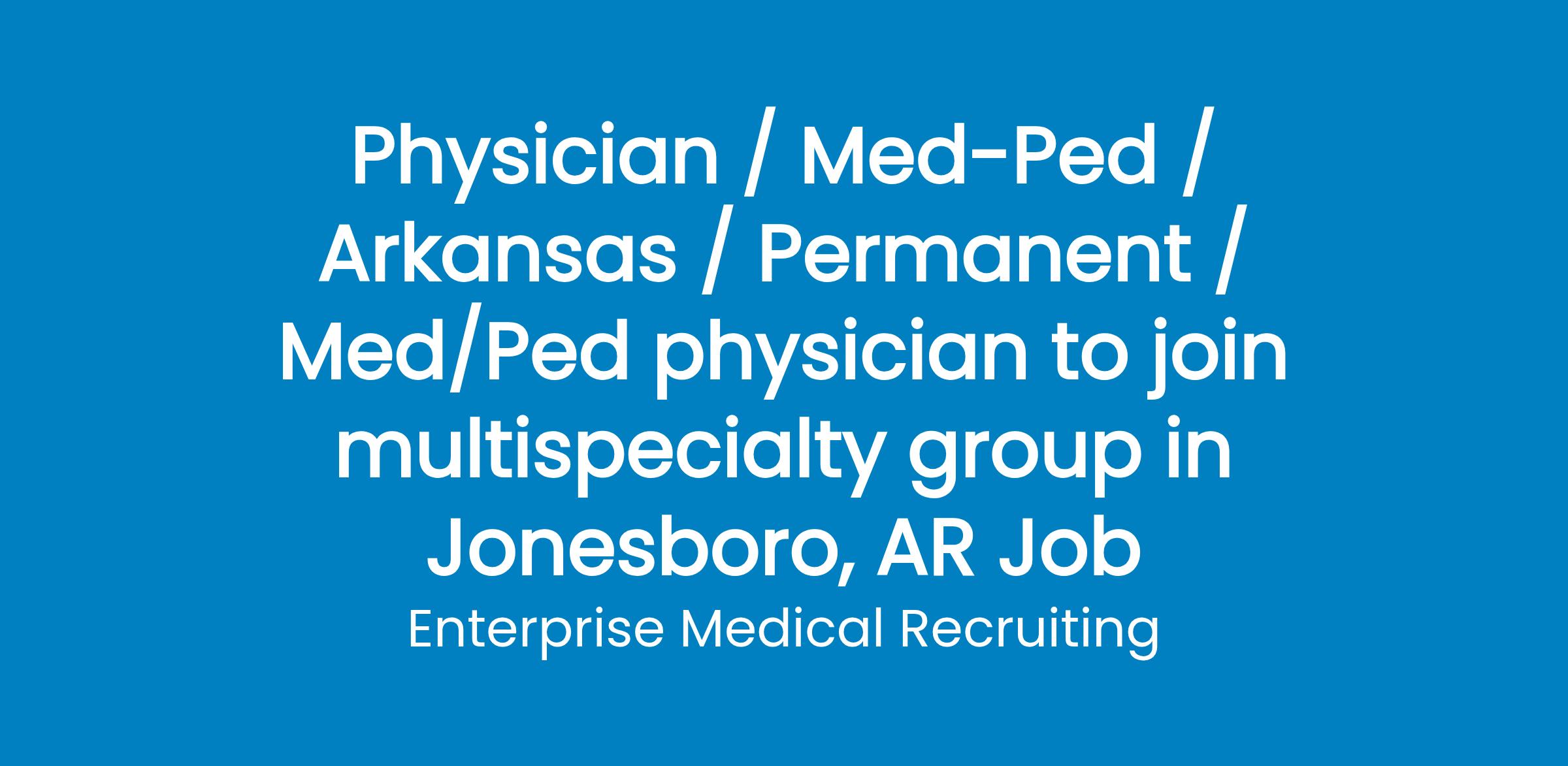 Enterprise Medical Recruiting is assisting an established 90+ provider multispecialty group in Jonesboro, AR with the recruitment of a BC/BE Internal Medicine/Pediatrics (Med/Ped) physician for a full-time, permanent, and employed position. Join a network of 25 full-time Family Medicine Physicians.