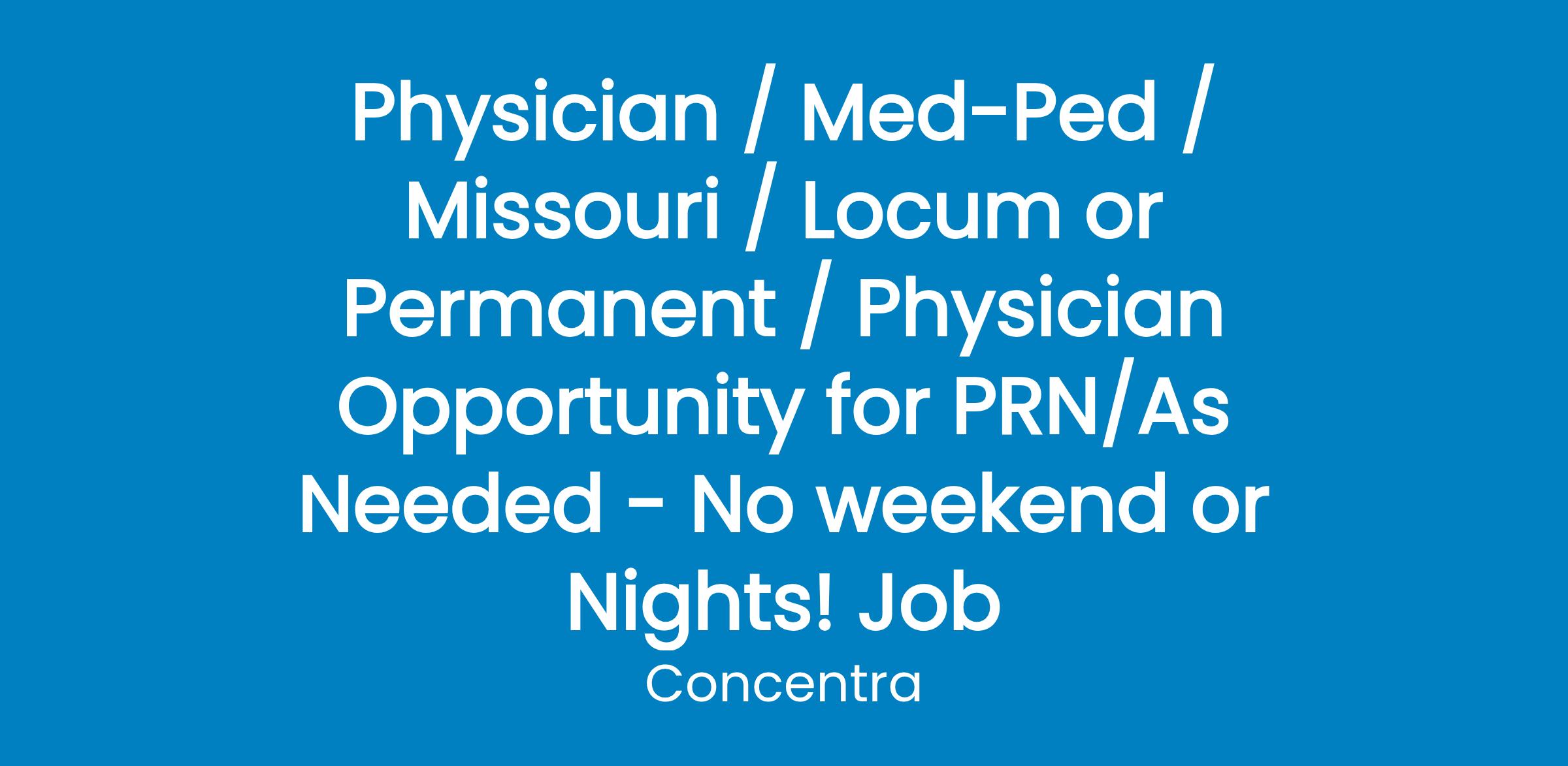 Concentra, one of the largest health care companies in the nation, is seeking a BC/BE Physician for our Missouri PRN (as needed coverage) opportunity! Your patients, as well as your medical and support team, will look to you for your excellent problem solving and leadership skills. As a Concentra PRN Physician, you will be accountable for assessing patients and providing treatments while ensuring an exceptional and reassuring experience. The treatments you provide will make a tremendous difference in the lives of those who look to us for care and comfort.At Concentra, you not only are rewarded by helping thousands of patients feel better each year but also by the recognition you receive as a leader within the company. Your ideas will be heard. In addition to patient care, every Physician has the opportunity to make an impact on procedures and policies at the Center. DETAILS & BENEFITS:Clinical environment w/minimal travelOccupational Medicine experience preferred, but we are willing to train otherwise qualified candidates in this area of medicineLicensure requirements of the state of jurisdictionGraduate of accredited MD or DO program of accredited universityUnrestricted DEA license for state of jurisdictionMust be eligible to participate in MedicareTraining Provided in Our World-Class Occupational Medicine Process Management ModelMedical Malpractice Coverage401(k) with Employer MatchEmployees with Concentra enjoy work and life equally