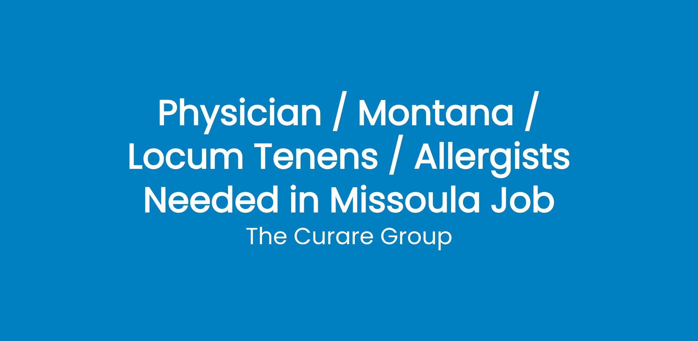 Allergists needed for booming single-specialty practice in Missoula looking to expand their team. In this full time Monday-Friday role you will be providing a wide variety of services to children & adults such as: state of the art allergy testing, utilizing prick testing methods with no needles, custom made allergy serums for immunotherapy injections, stinging insect venoms, Lung function (PFT) & much more. With Lolo National Forest in your backyard, this is an outdoorsman's dream location!Single-Specialty Allergy Group. Full time position; Monday-Friday no weekends. Providing a variety of Allergy services such as: PFT & ENO testing, Oral food & Drug challenges . This practice utilizes state of the art prick testing methods containing no needles. 45 minutes to Lolo National Forest and Airport with direct flights to Dallas, Chicago & Denver.