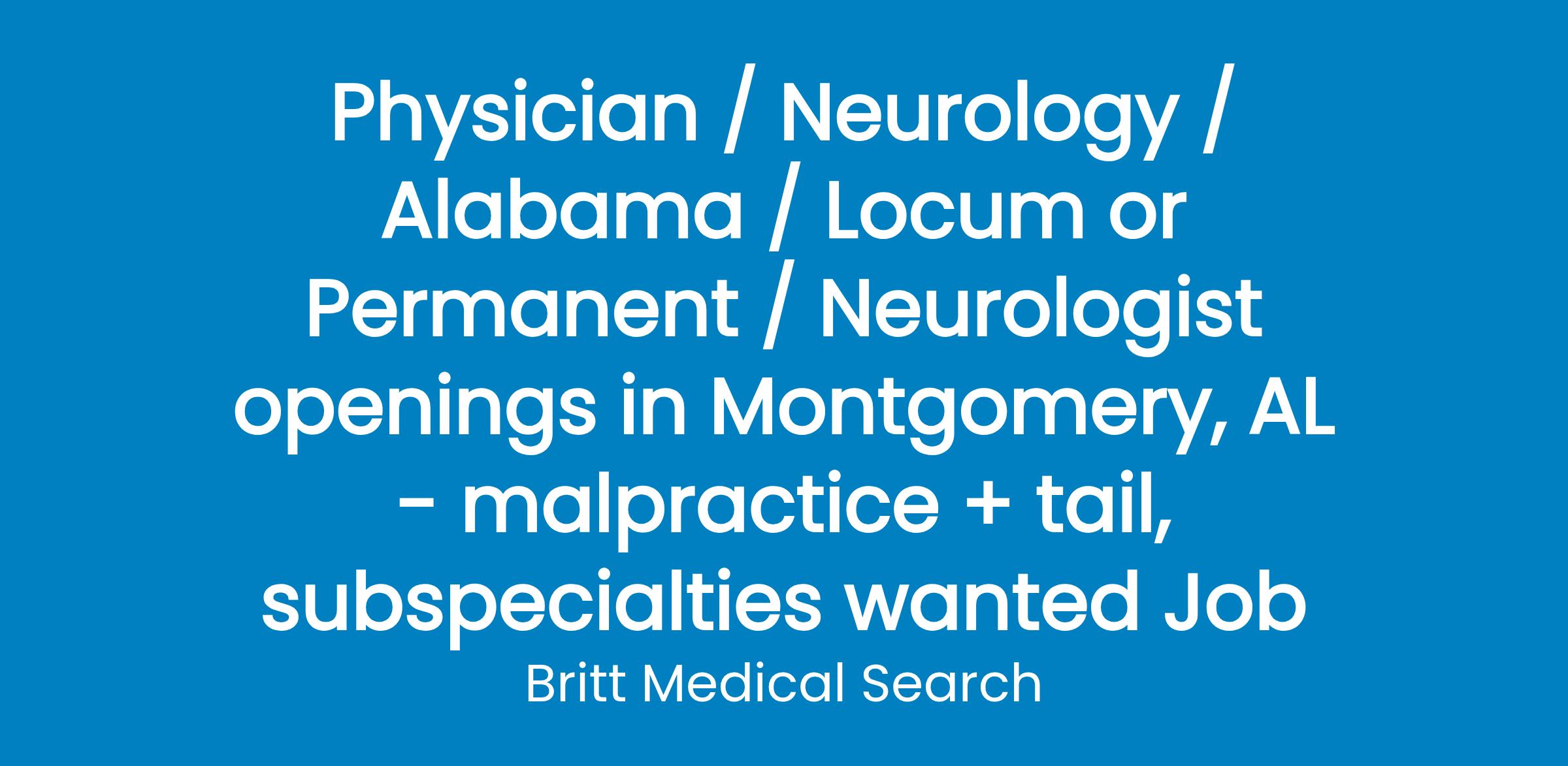 Clinic is supported by excellent specialists and ancillary support staff. It is affiliated with the largest non-governmental employer in Montgomery serving a 14 county area of 600,000 people. This is a 100% outpatient role. The ideal candidate will offer general neurology services with the opportunity to practice sub-specialty interest.