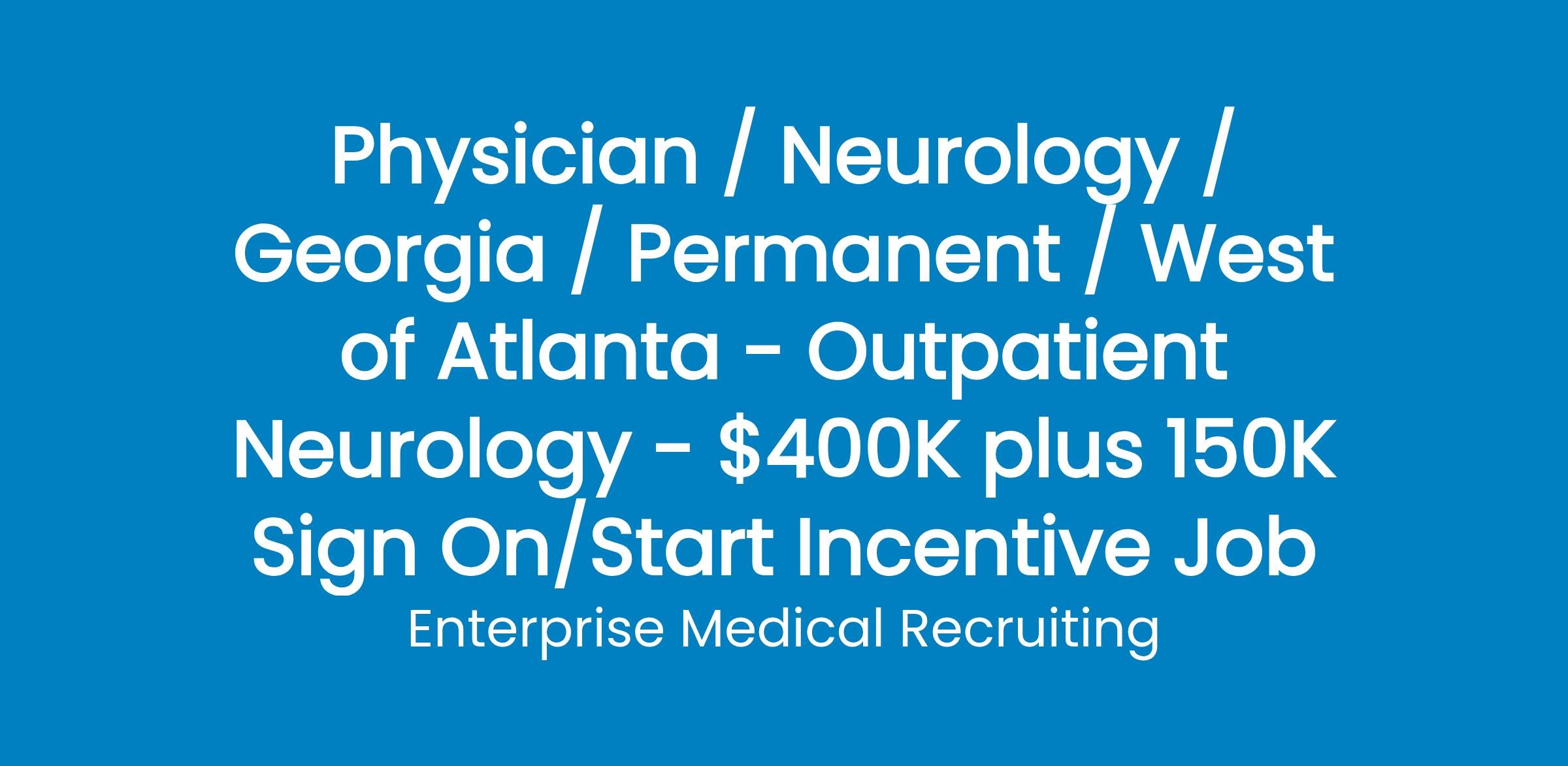 Enterprise Medical Recruiting is assisting a Health System just west of Atlanta, Georgia, to recruit a new Outpatient Neurologist!