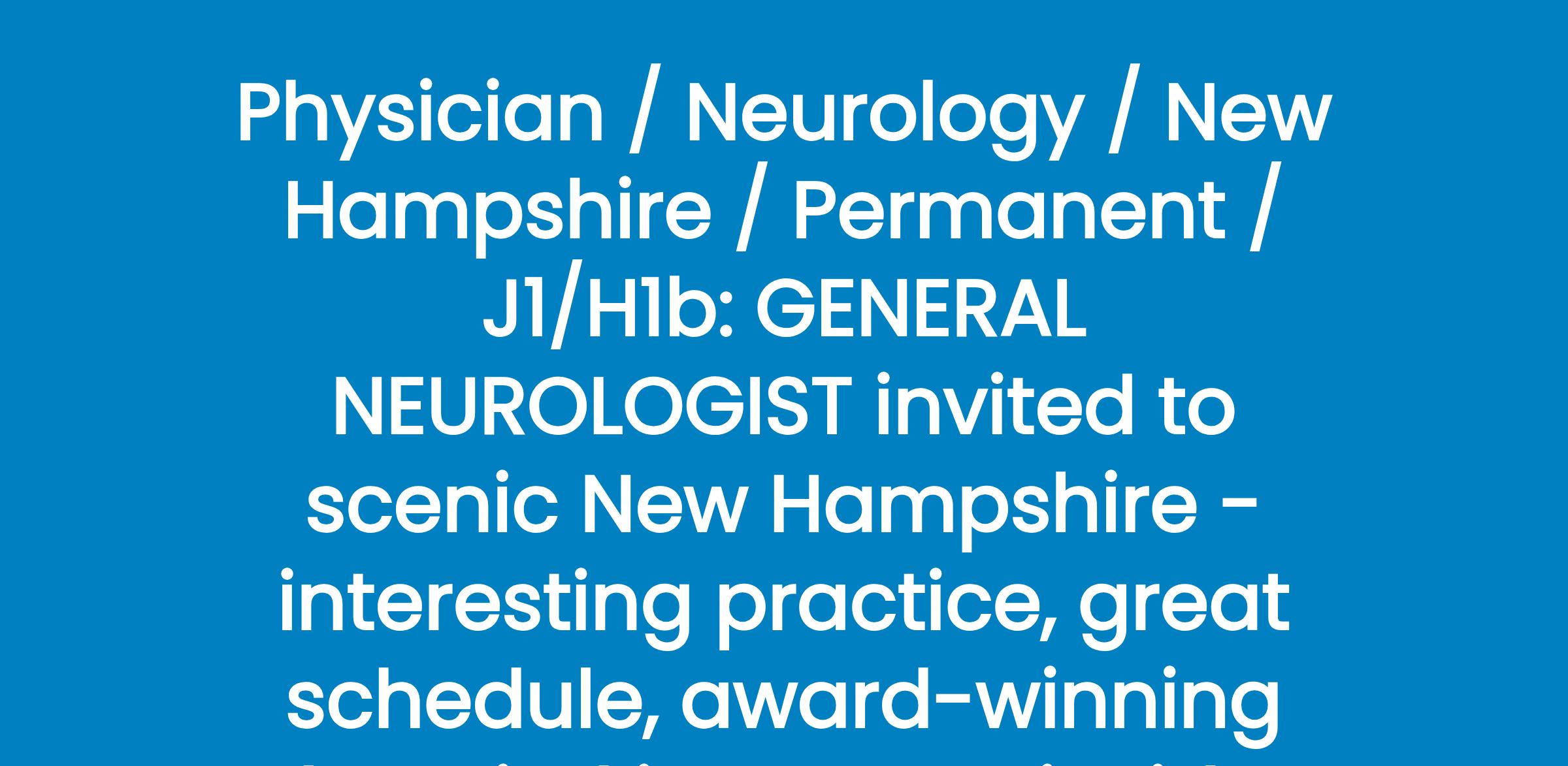 Berlin, New Hampshire: We seek a talented NEUROLOGIST on behalf of a Top 100 Critical Access Hospital in picturesque New Hampshire. In this pretty town near the White Mountain National Forest, you will join a popular and productive senior Neurologist in an office-based general practice. Enjoy professional variety with an interesting mix of cases that include headaches and migraines, MS, stroke, seizures/epilepsy, polyneuropathy, dementia and memory disorders, movement disorders, etc. The ability to interpret EEG studies is desirable, but not required.Physicians requiring H1b or J1 visa support are encouraged to apply. This is an equal opportunity employer. This is an expansion position created to meet the growing need for services in the community.Practice in a setting that encourages more time with your patients volume averages just 12-16 patients/day ages 16 and older so you can get to know them on a more personal level. You will provide medication management, order diagnostic testing, educate and counsel patients and families, and make referrals as appropriate. A high level of customer service/patient satisfaction is expected. You will be supported by specialists from nearby academic medical centers, and by a caring hospital leadership team. Enjoy an excellent work-life balance with autonomy in your individual practice. Your schedule will include 4 clinic days and one admin half-day per week, which you can do from home. There is NO CALL.Teaching options are available too, with medical students and PA students rotating through the hospital. This medical center applies the latest technology in many ways, such as an EMR system with integrated voice recognition/templates ready for your use. Imaging, lab, physical/occupational therapy and more are on-site.You will earn a salary of $300K OR MORE (based on experience) with benefits including a cash starting bonus, an annual quality/citizenship bonus, paid relocation assistance, paid liability insurance with tail coverage, health, dental and vision insurance, disability and life insurance, 5 weeks of paid vacation time, 6 paid holidays, 5 sick days, 2 weeks of paid leave plus a budget for your CME, and participation in a retirement plan. Student loan assistance is also available.Berlin is a beautiful mountainside town that attracts recreational tourists in all seasons. Enjoy scenic vistas at every turn. With a population of 16,000, you will appreciate clean, friendly, small-town living in a region that draws people seeking a beautiful place to live, work and play. This low crime area is attractive to people of all ages. Outdoor activities abound, with unlimited trails for hiking or mountain biking in the White Mountains, plus fishing and hunting, kayaking and canoeing, horseback riding, golf, camping, snowmobiling and more. Popular ski resorts are within an hours drive and offer cross-country or alpine skiing and snowboarding.This is a wonderful place to raise a family: First-rate local schools earn awards for quality and parental involvement. Private schools in Maine and New Hampshire are in easy reach. Montessori schools operate in several towns. Housing costs are also reasonable. Many physicians purchase homes with substantial land (10-100 acres) offering magnificent mountain views. New Hampshire is also financially attractive, with NO SALES TAX AND NO INCOME TAX.Berlin offers access to larger cities (2-2.5 hours to Portland, Maine; Burlington, Vermont; and Manchester, NH). Boston and Montreal are 3-3.5 hours away. Contact us today to learn about this desirable new position.We are offering:Join a friendly, scenic mountainside communityPaid relocation assistanceGeneral practice alongside a popular senior NeurologistInteresting case variety, teaching opportunitiesModest volume, 12-16 patients/daySecure employment with award-winning hospitalJ1 or H1b visa support available, costs paidConvenient 4.5 day schedule, admin half-day at home, NO CALLCompetitive salary, $300K OR MORECash starting bonus, annual quality bonusPaid liability insurance with tail coverageHealth, dental, vision insurance, disability, life insurance5 weeks of paid vacation time, 6 paid holidays, 5 sick days2 weeks of paid leave plus a budget for your CME Choice of retirement plansStudent loan repayment also available