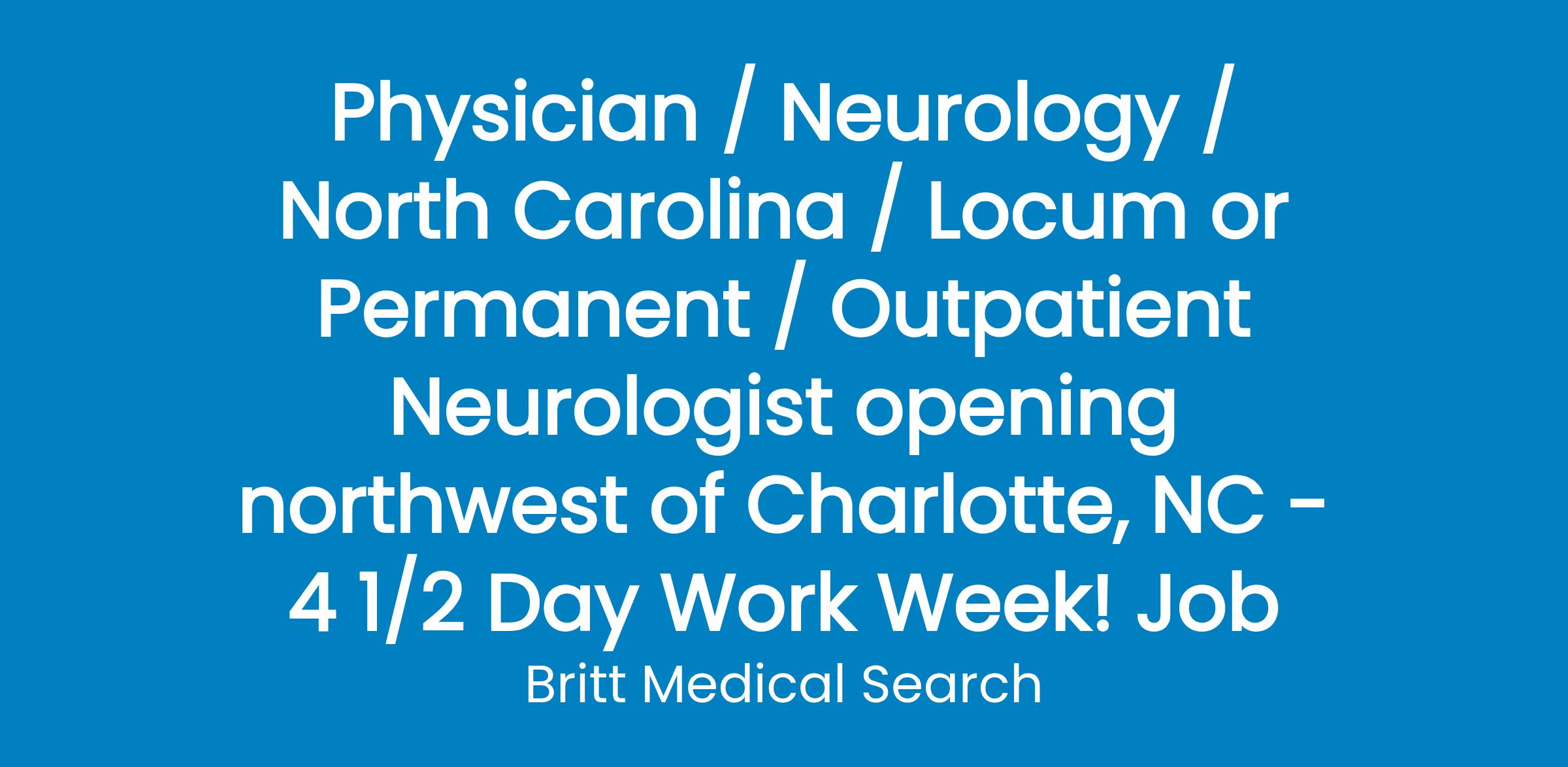 Medical Center NW of Charlotte, NC is seeking a BC/BE Outpatient Neurologist. The ideal candidate will be comfortable, initially, in a solo practice and interested in helping to build a neurology program.