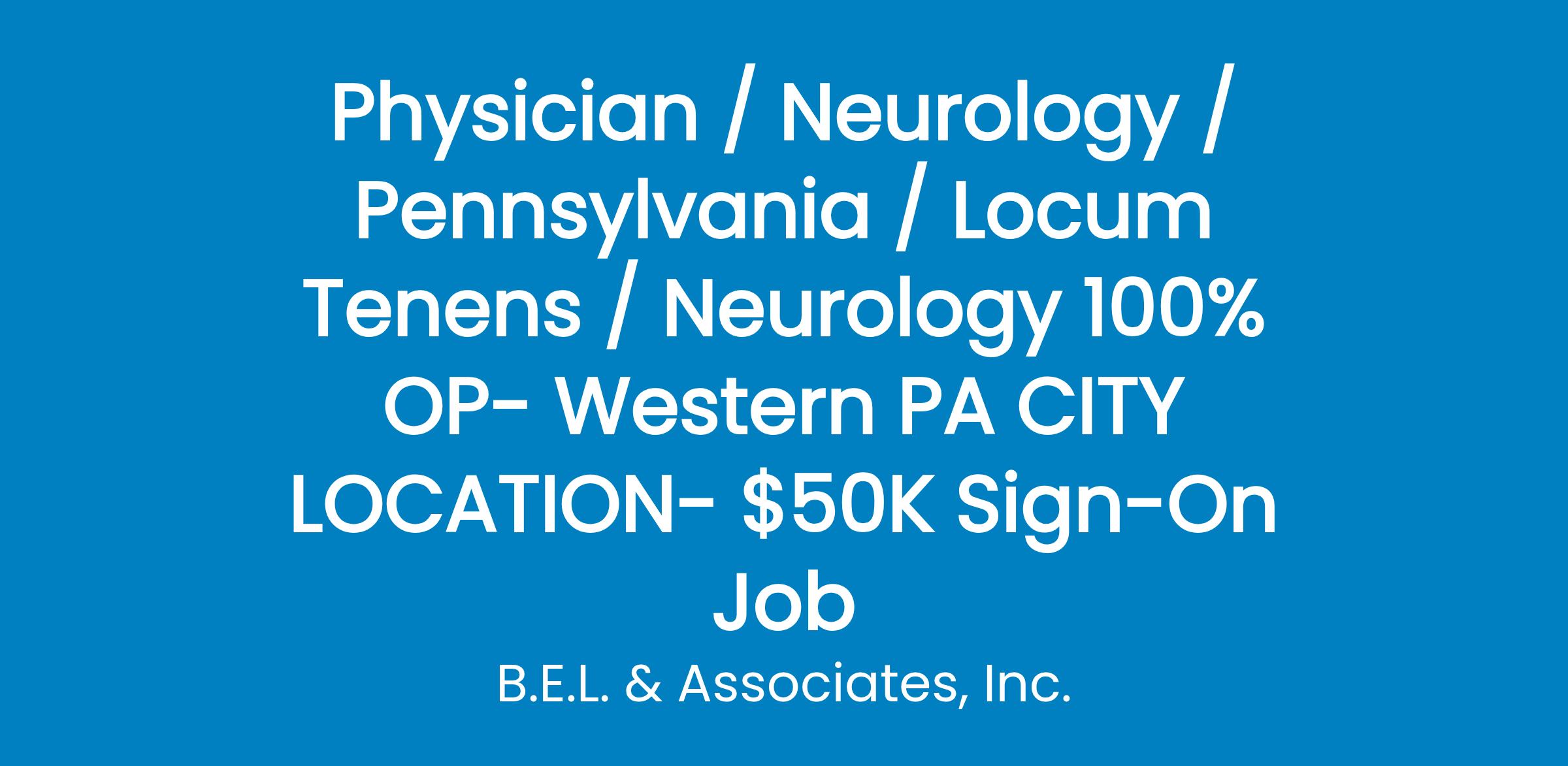 Neurologist 100% outpatient work plus teaching if so desired at residency program - western PA - with $50K sign on bonus and residency stipend for first and second year neurology residents. Join large department of 8 neurologists and 7 neurosurgeons plus neurohospitalists and neurointerventionalists and many APPS plus residents. The group has subspecialists in MS, Neuro Muscular Disease, Movement Disorder, Headache, Sleep, Epilepsy and Stroke. Opportunity to teach and do research if so desired at this longstanding neurology residency program on site. Hospital employed provides great benefits, competitive compensation with productivity incentive, sign on bonus, PTO, CME days and stipend, relocation, retirement plan, occurrence malpractice insurance, and much more. Base salary plus productivity. They can take H1b candidates for this opening. It is over an hour from Pittsburgh, PA at a large tertiary care center.