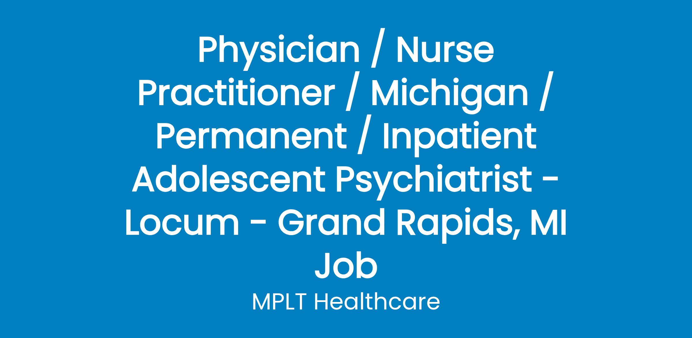 MPLT Healthcare is looking for Physicians who Understand the Urgency, Never Give Up, and Have the Courage to Excel in the forever changing medical industry! We have numerous opportunities for an experienced Inpatient Adolescent Psychiatrist with highly competitive pay rates in Grand Rapids, MI.