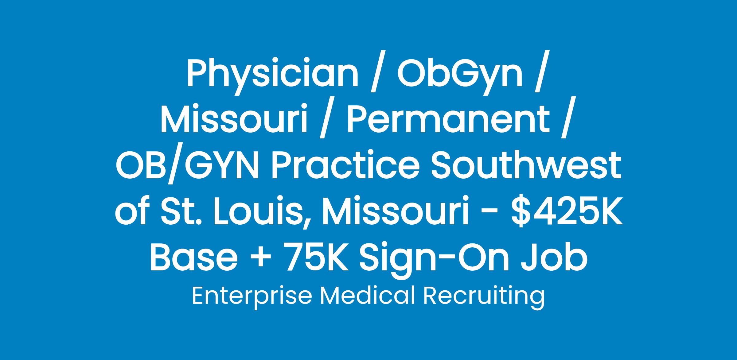 Enterprise Medical Recruiting is assisting a health system to recruit an OB/GYN physician for an established practice located Southwest of St. Louis, Missouri.