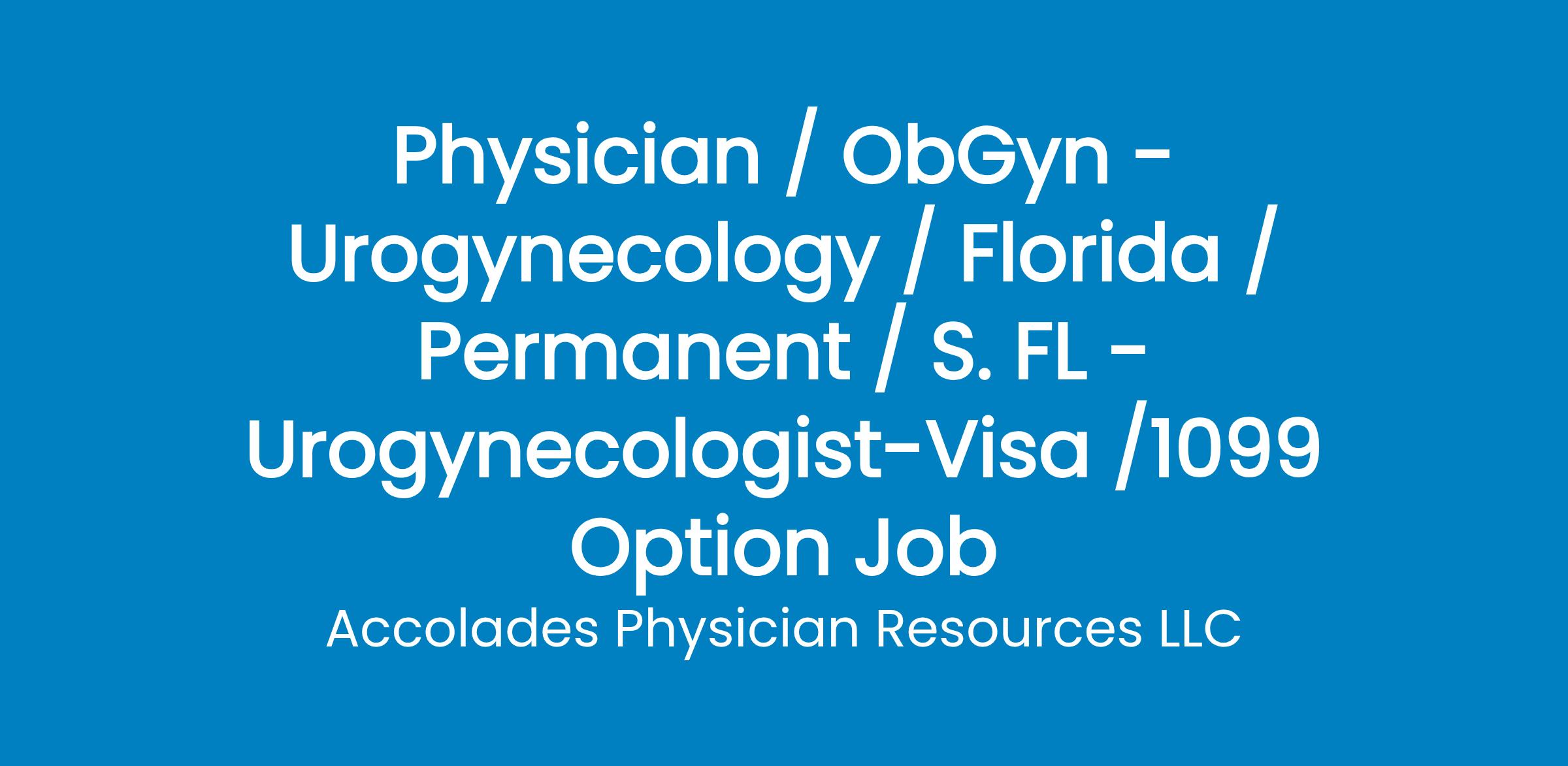 SOUTH FLORIDA UROGYNECOLOGIST OPPORTUNITYCOMMUNITYLive and work in Fort Lauderdale /South Florida. Easy access to popular beaches, metro amenities & fine dining. Fun for entire family, NCAA & Professional sports & much more. All with no state income tax.OVERVIEWDue to expansion, private OBGYN group is adding a Urogynecologist specialist to medical staff. Will have a brand new clinic in Fort Lauderdale area in early 2026. ROLE Join existing single specialty practice of 5 physicians Monday thru Friday schedule /flexible Support by RN, MA + Midwives & Nurse Practitioners Admit to one hospitalOpportunity for clinical trials & protected administrative timeBe busy immediatelyEMR AthenaWill sponsor H1B visa or J1 waiverPACKAGESalary range $300-$400k$10 relocation/sign on bonusMalpractice paidCME & more