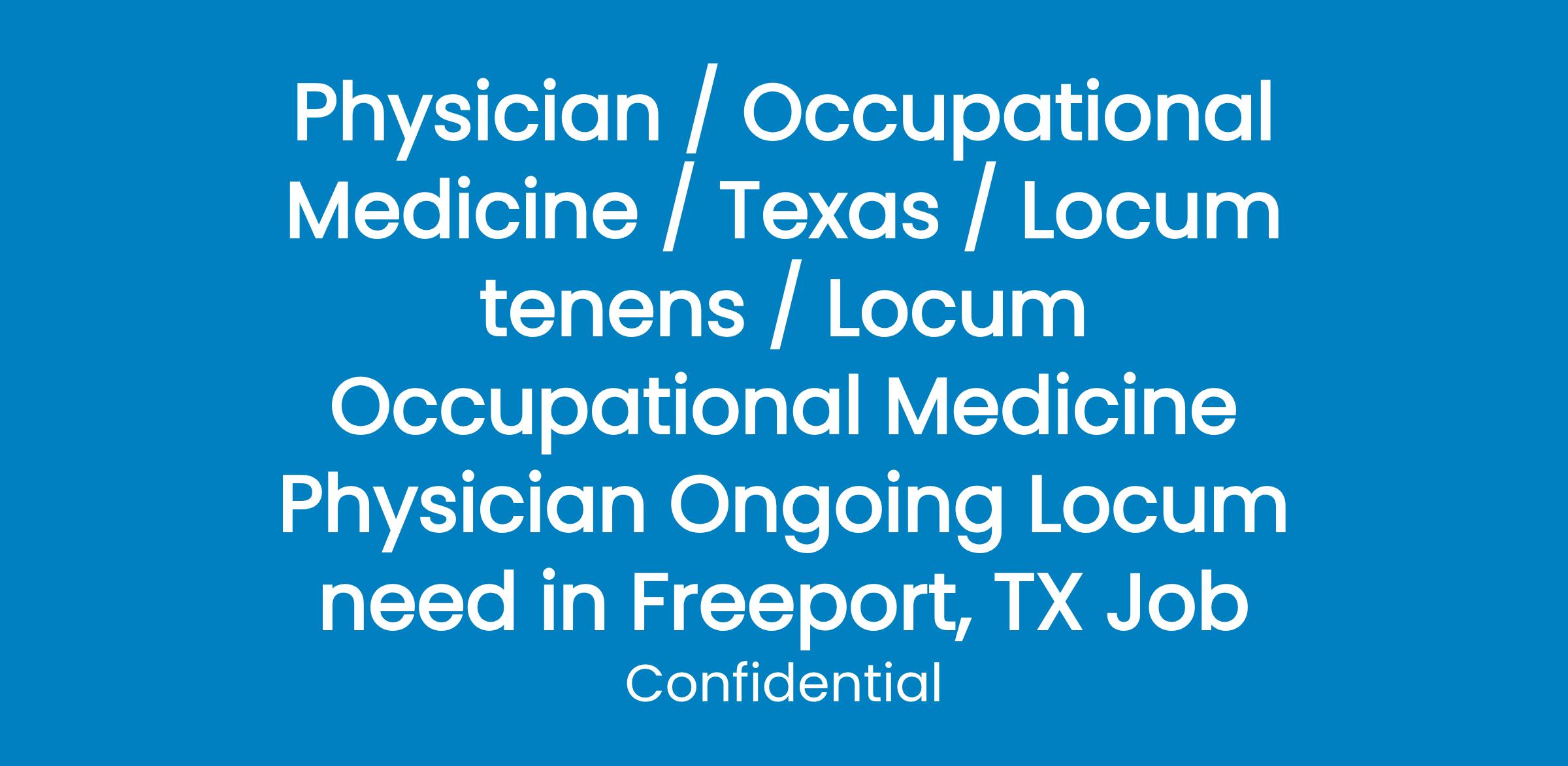 Schedule Monday - Friday from 8 am - 5 pm. We are seeking qualified physicians for a Freeport, TX-based locum opportunity, where youll have the opportunity to work on a short-term basis for an outpatient clinic. During this assignment, youll be accountable for treating both scheduled and walk-in work related injuries and urgent care patients in an outpatient clinic setting. Youll also diagnose and treat work-related injuries, perform pre-placement, DOT, public safety, and surveillance physical examinations for varied private companies and governmental agencies.