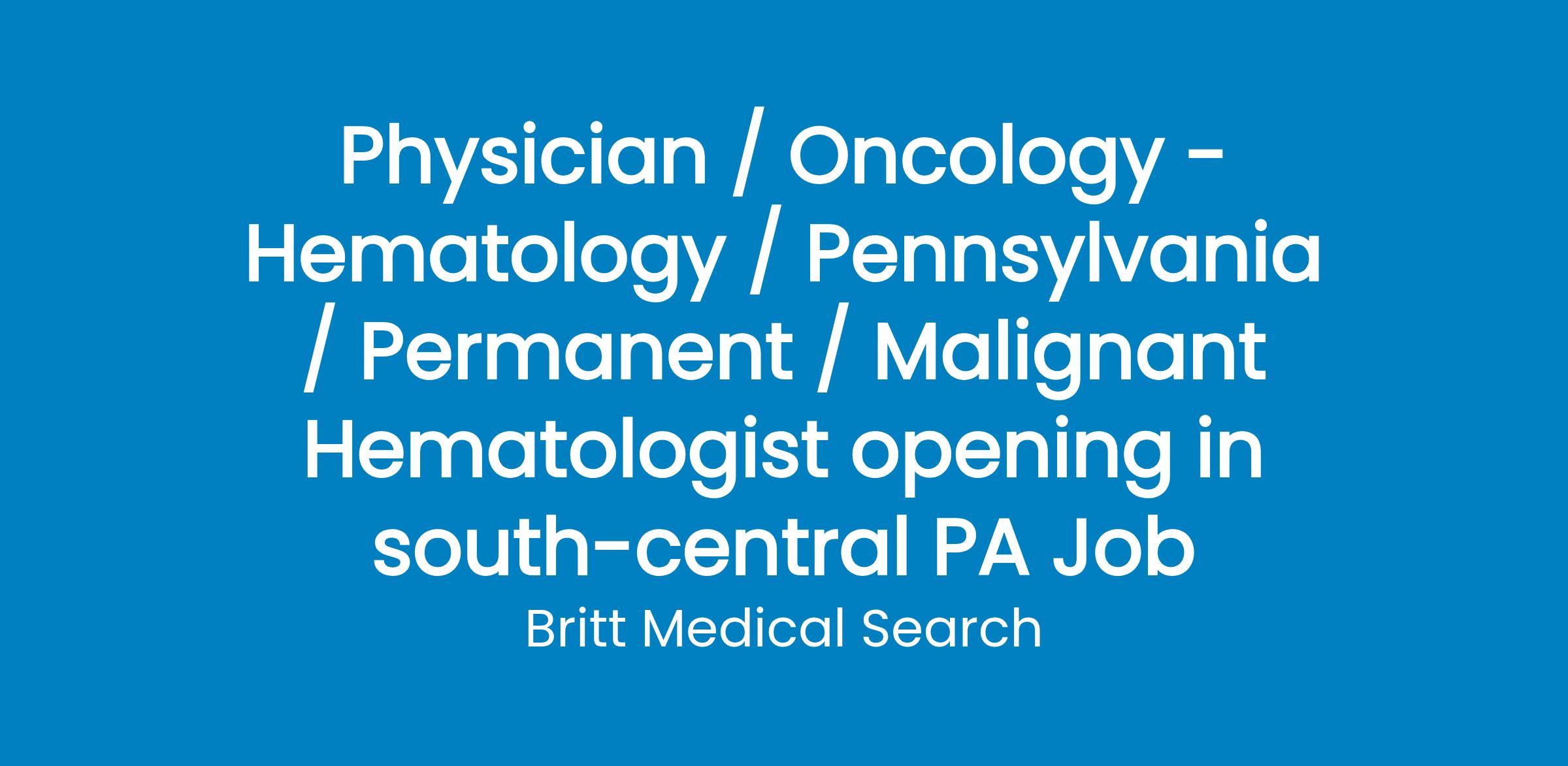 Seeking a BC/BE Physician in the sub-specialty of malignant hematology to join a growing network of medical oncologists/hematologists in south-central Pennsylvania.Details: - Responsibilities will include inpatient consults and an outpatient clinic for malignant hematology
