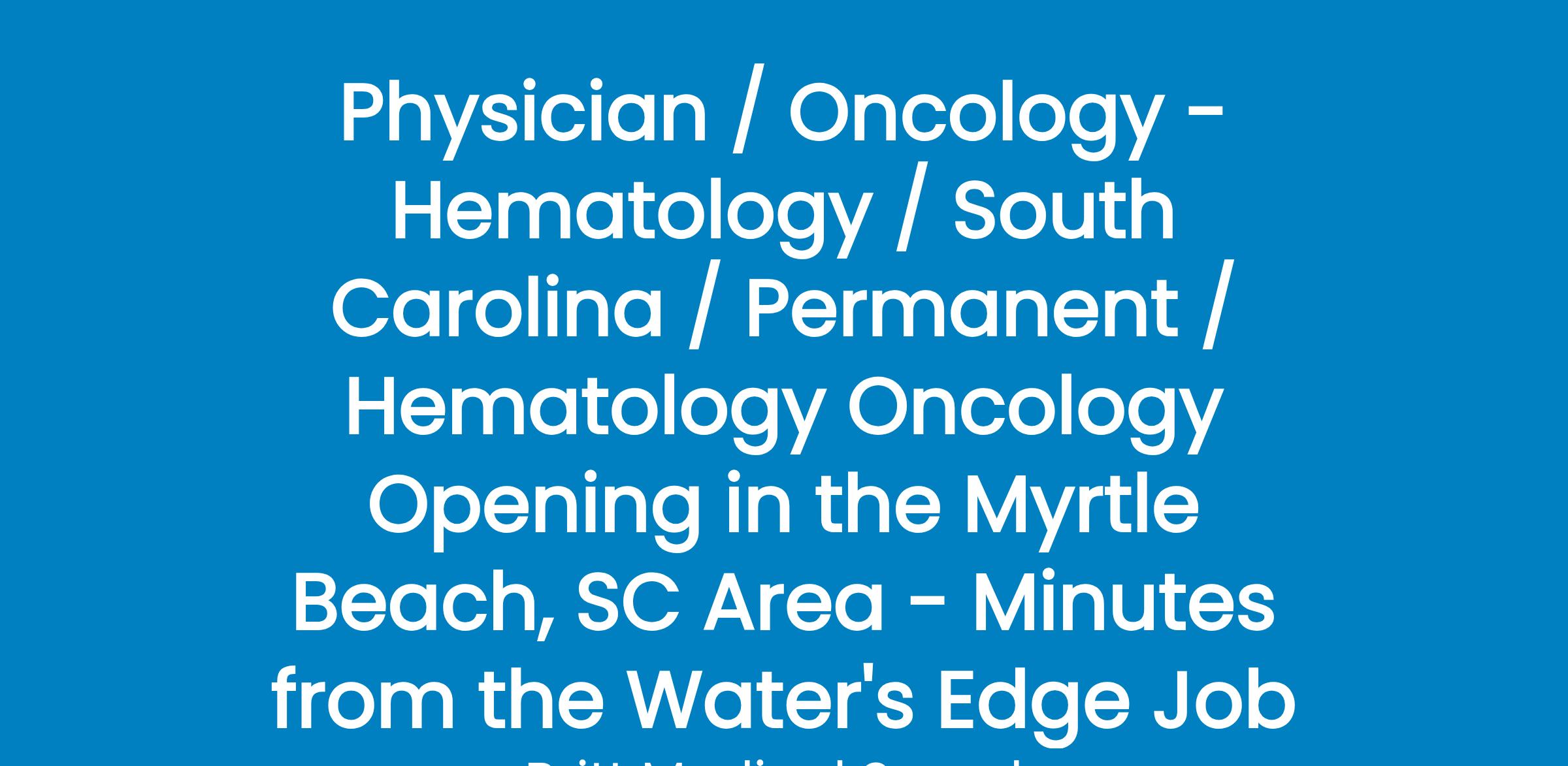 110 bed hospital in Coastal South Carolina is seeking to add a Hematology/Oncology physician for its 2 physician practice in the Myrtle Beach area. This is an employed position that has the support of the Hospitalist Team for any Oncology Admissions. This is a traditional opportunity requiring outpatient and inpatient work.