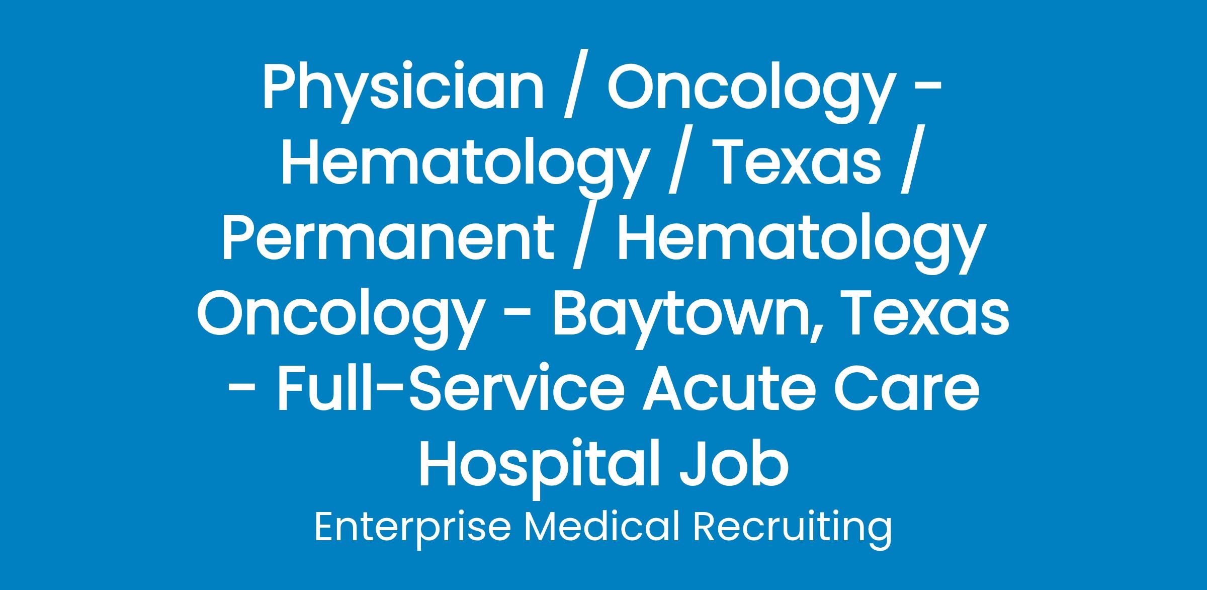 Enterprise Medical is partnering with a prominent healthcare system in the Houston area in its search for a board-certified hematologist/oncologist.The practice is located just25 miles east of downtown Houston