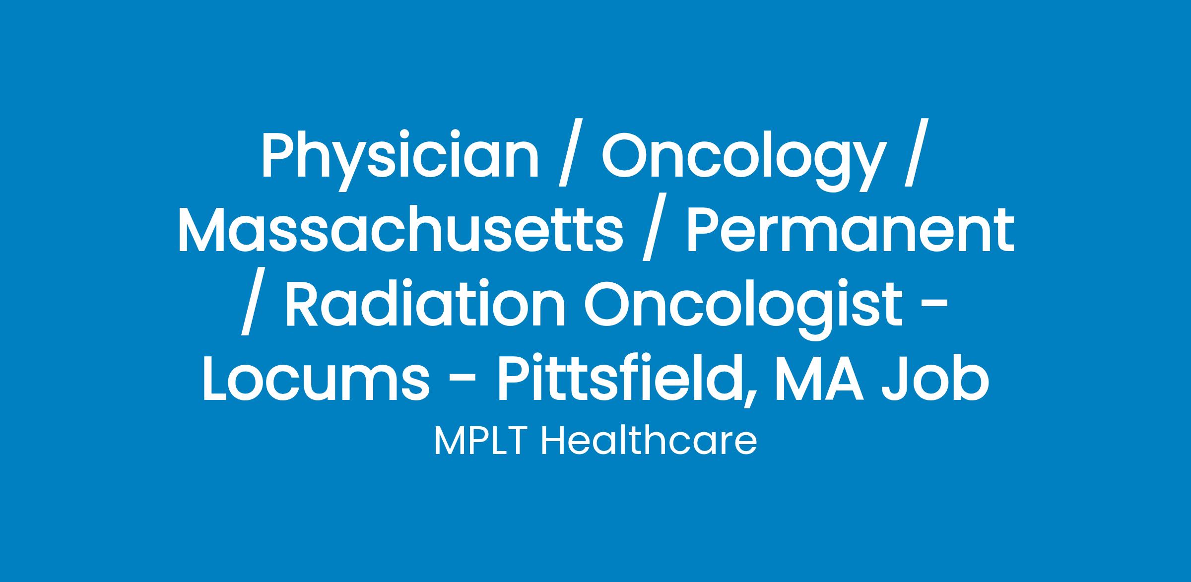 MPLT Healthcare is looking for physicians who Understand the Urgency, Never Give Up, and Have the Courage to Excel in the forever changing medical industry! We have numerous opportunities for an experienced Radiation Oncologist with highly competitive pay rates in Pittsfield, MA.