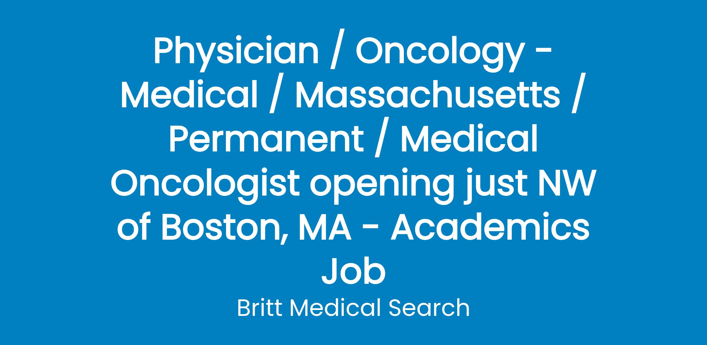 Seeking a full-time BC/BE Medical Oncologist specializing in the care of Thoracic Cancer Patients to join their team just northwest of Boston.