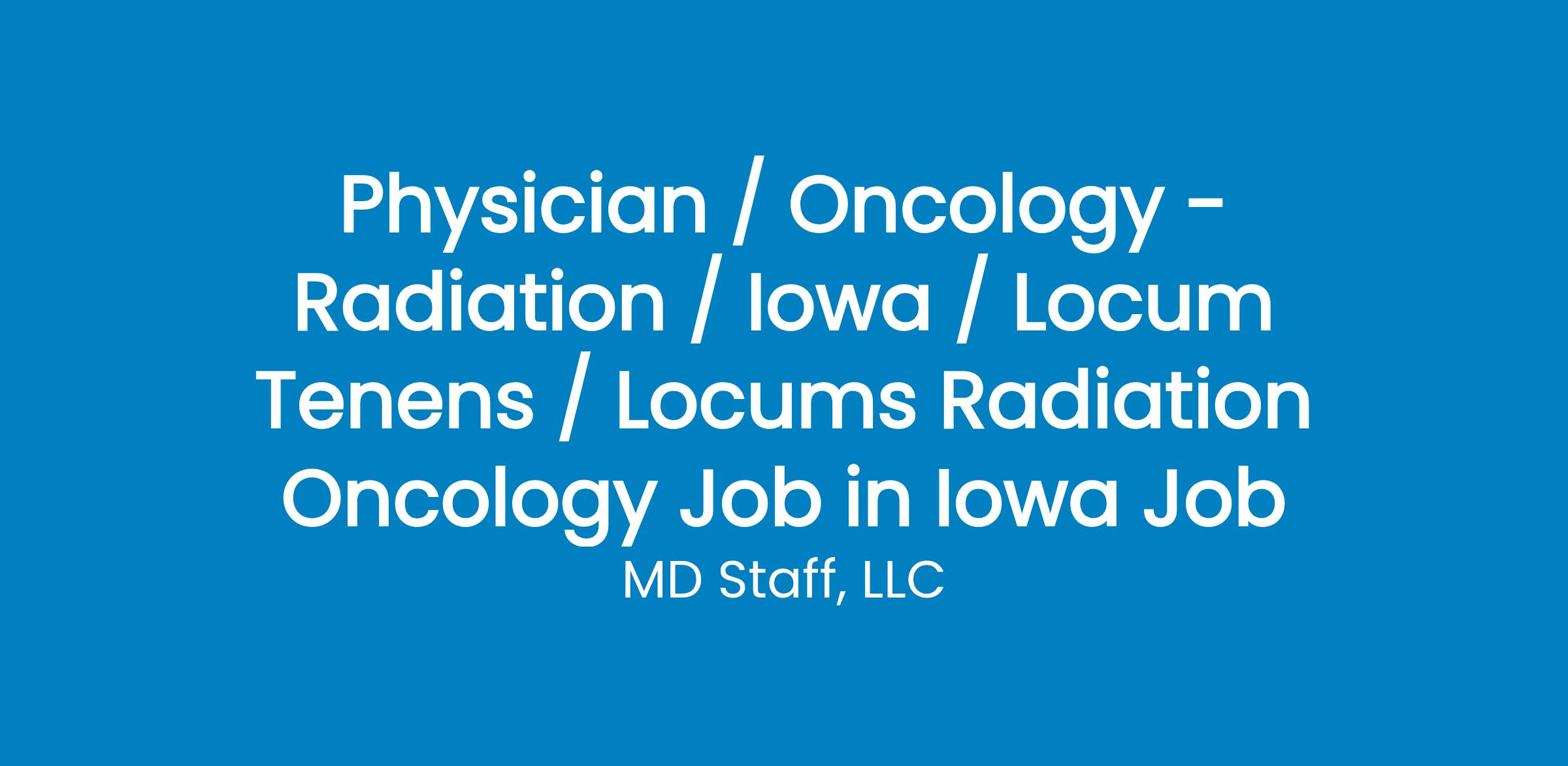 Seeking a Locum Radiation Oncologist in Iowa Coverage dates: ASAP - Ongoing. Shift is 8 AM to 5:00 PM with 30 minutes for lunch - 8 hours per day. No call. The candidate must be Board Certified and licensed in IA. Located near Central City,IA. If you are interested in hearing more about this opportunity, please call or text MD Staff at . You can also reach us through email at . Please reference Job ID .