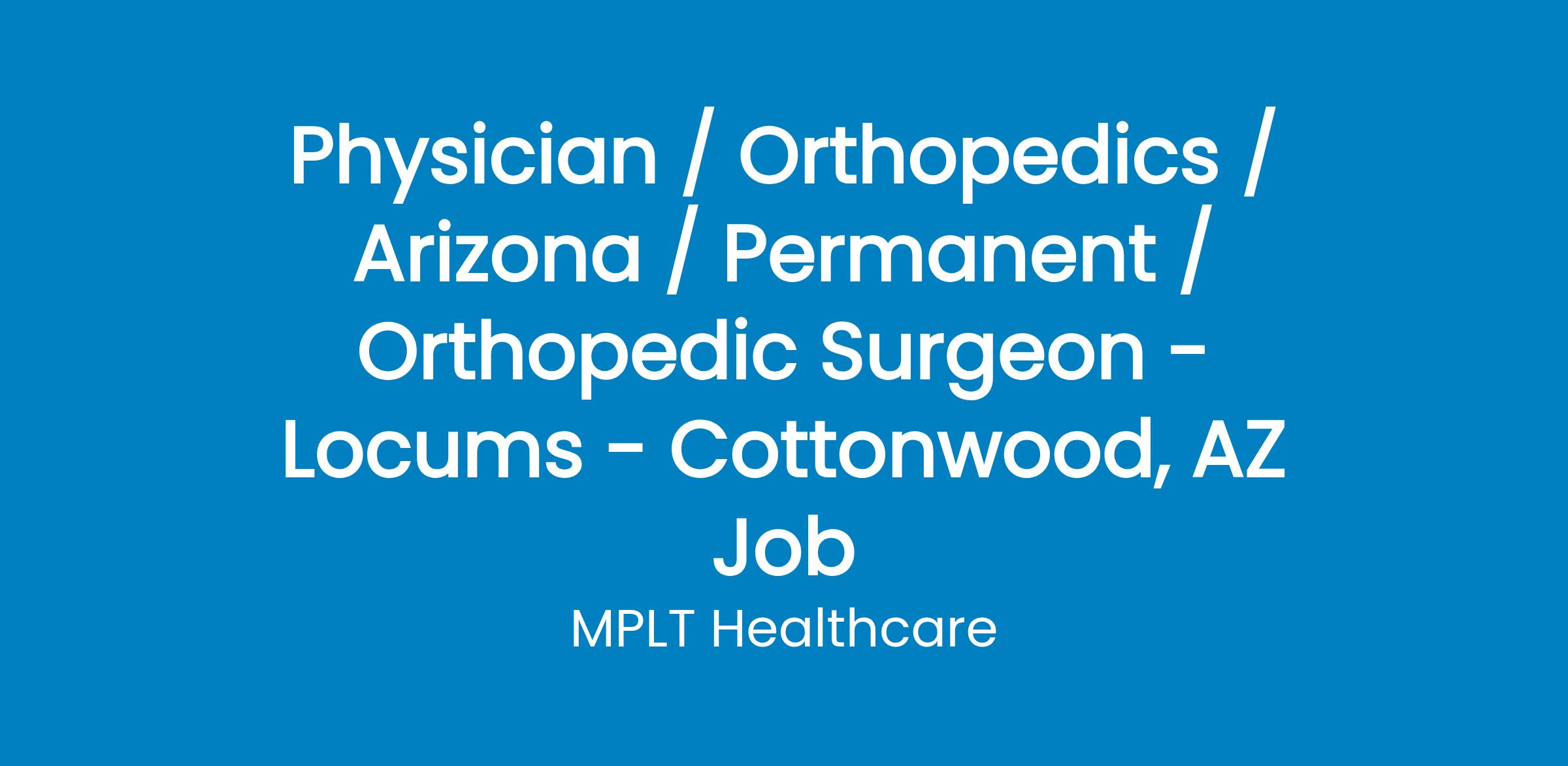 MPLT Healthcare is looking for physicians who Understand the Urgency, Never Give Up, and Have the Courage to Excel in the forever changing medical industry! We have numerous opportunities for an experienced Orthopedic Surgeon with highly competitive pay rates in Cottonwood, AZ.