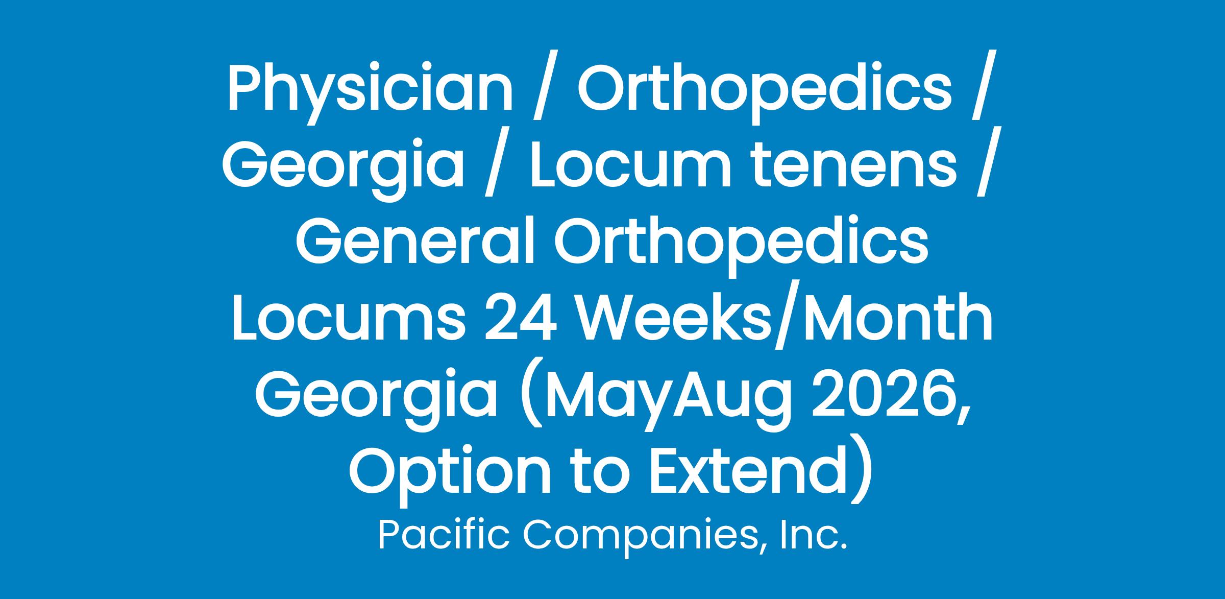 Flexible Schedule General Orthopedics Locums Georgia Are you open to exploring an Orthopedic Surgery locum opportunity onsite in Georgia? I'm working with a group seeking outpatient and inpatient orthopedic coverage with flexible scheduling and a minimum of 2 weeks per month. If interested, when would be a good time to connect? Please call/text at your convenience. Opportunity Overview Orthopedics Locums Location: LaGrange, GA 30240 1hr outside of Atlanta Duration: May 2026 August 2026 (Potential to extend) Schedule: 34 clinic days/week + 24-hr call coverage; minimum 2 weeks/month, full-time preferred Shift: 8a5p clinic Call: 24-hr call, 7a7a (weekday and weekend) Scope of Practice: Mix of inpatient and outpatient general orthopedics and fracture care; 90% adults / 10% pediatrics; 1520 clinic patients/dayEMR: EPIC Group/Support: 3 CMAs, 1 RN, 1 RN supervisor, 1 rad tech, 1 DO, 1 APP in clinic Hospital: Level 4 trauma center Requirements: GA license, Board Certified/Eligible, Clean Background Locum Includes: 1099 Contract A+ Malpractice Coverage Credentialing Assistance Competitive hourly pay Full travel provided Assistance with credentialing provided estimated 90 day credentialing . Call, Text, or Email for further details. If you're interested or know someone who may be a fit, please send your availability and a current CV. All inquiries are kept strictly confidential, and we offer a $1,000 referral bonus. Looking forward to connecting with you soon. Thank you, Camille McNairy Senior Recruiter Pacific Companies Call/text: