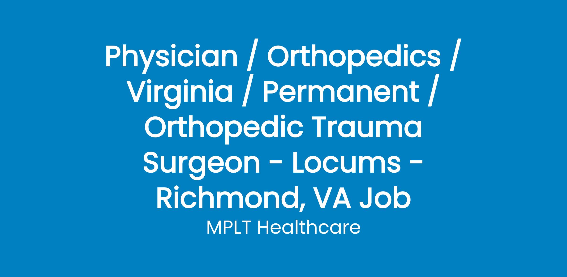 MPLT Healthcare is looking for physicians who Understand the Urgency, Never Give Up, and Have the Courage to Excel in the forever changing medical industry! We have numerous opportunities for an experienced Orthopedic Trauma Surgeon with highly competitive pay rates in Richmond, VA .