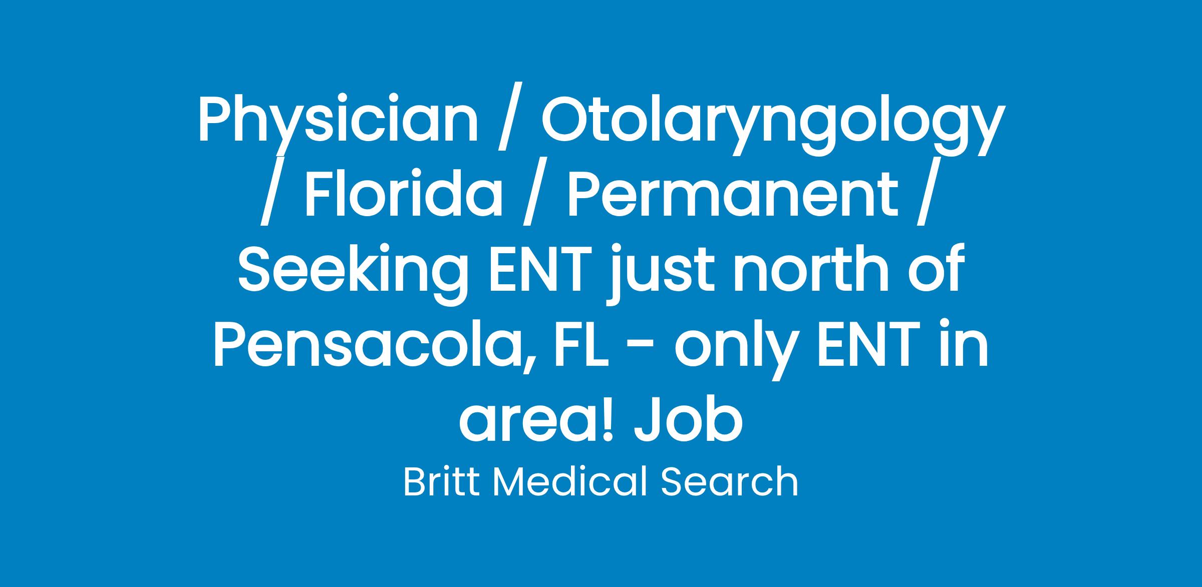Medical Center in Milton, FL is seeking a BC/BE Otolaryngologist to join an employed ENT. No other ENT's in the area.