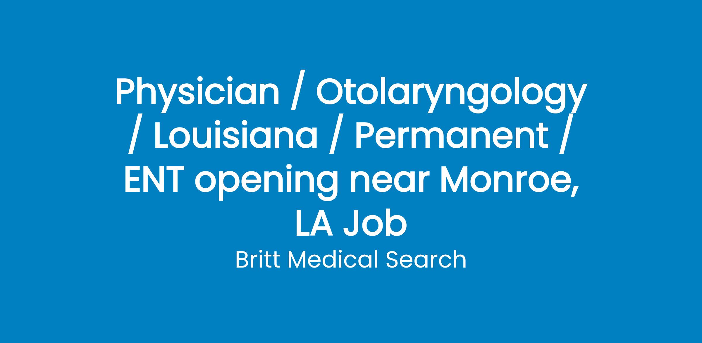 We have an outstanding opportunity for a board certified / licensed ENT to join a multi-specialty group with 9 primary care physicians, 15 specialists and 10 NP s. This is an employment opportunity with the hospital and greatly supported by hospital administration. This is a full-time position with 10 nights of ER call. Incoming candidate must be skilled in general ENT: management of allergy and sinus, functional nasal airway surgery, thyroid/salivary gland surgery, endoscopic ear surgery, sinuplasty and rhinoplasty.