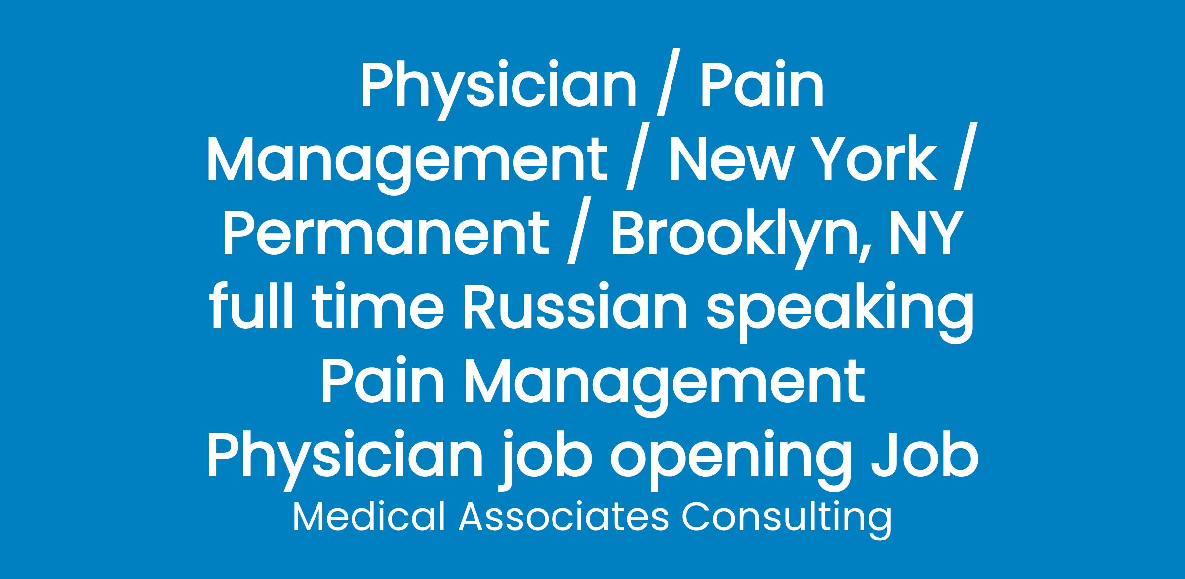 n established private practice in Brooklyn NY near NYC has a full time Russian speaking Pain Management Physician job opening for interventional pain cases including radiofrequencies, spinals, epidurals, knees, shoulders, EMGs. Pain fellows welcome. PM&R trained Physicians preferred & group will consider anesthesia trained Physicians. Offers $300K W-2 base salary, production bonus (30% of collections), full benefits including malpractice, medical insurance, (4) weeks vacation, retirement plan (401K after 1 year). (2) year partnership income of $600k. There's (3) Pain management Physicians & (2) NPs in the group. Great location in the NYC area with a plethora of things to do!