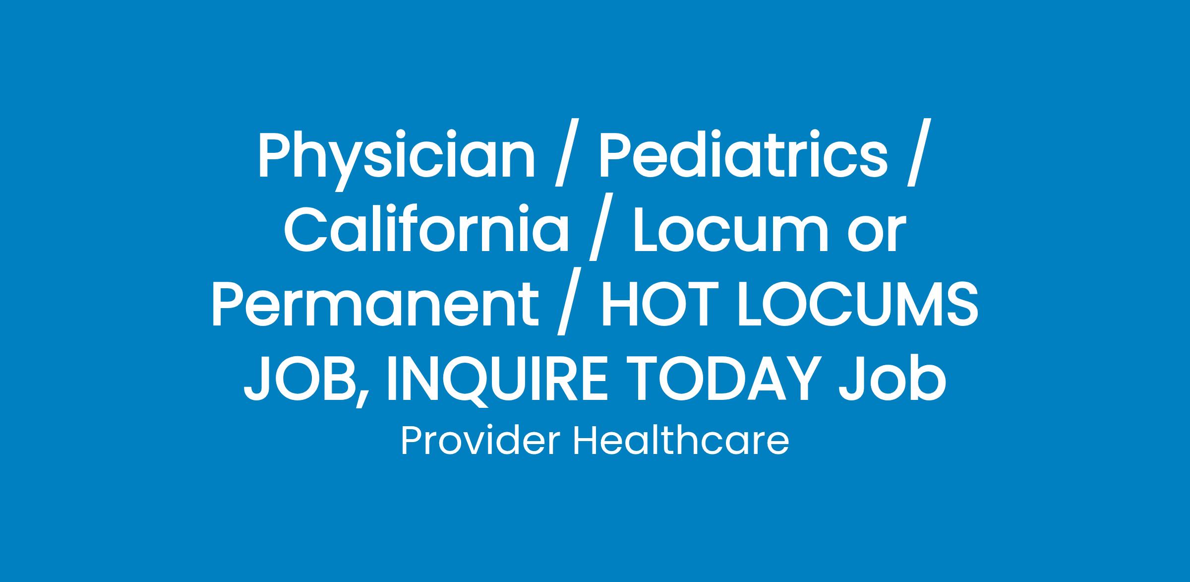 Locum Tenens Pediatrician in California High Pay & Flexible Schedule!Looking for top pay, flexibility, and adventure? Work as a Locum Tenens Pediatrician in California and enjoy the freedom to set your schedule while making a difference in diverse communities.Why Choose Locum Tenens Top Compensation Competitive pay with travel and housing covered.? Flexible Scheduling Choose assignments that fit your lifestyle.? Diverse Practice Settings Clinics, hospitals, and outpatient centers.? Hassle-Free Process We handle licensing, travel, and malpractice insurance.? No Long-Term Commitment Explore different locations without a permanent move.What Were Looking For:Board-Certified/Board-Eligible Pediatrician (MD/DO)Active California Medical License (or ability to obtain)Strong clinical skills and adaptabilityWhy California?From San Diegos beaches to Napa Valleys wine country, California offers endless adventure. Enjoy incredible weather, world-class dining, and exciting professional opportunitiesall while earning top pay!Apply Now! Send your CV to Call/Text Kassidy at for details Visit to learn moreStart your locum tenens journeyapply today!