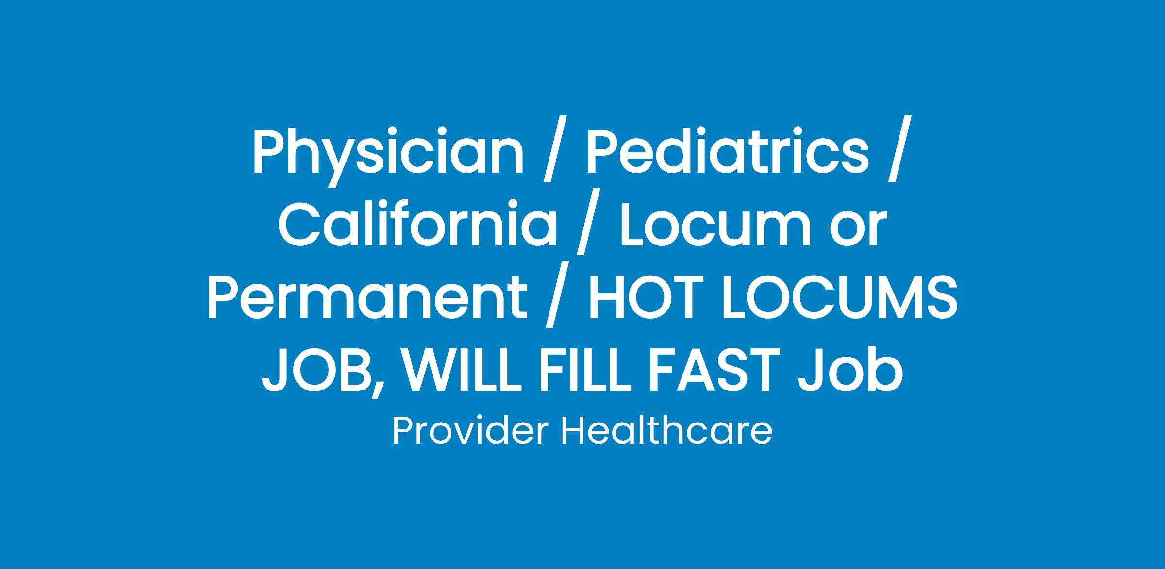 Physician / Pediatrics / California / Locum or Permanent / HOT LOCUMS JOB, WILL FILL FAST Job
