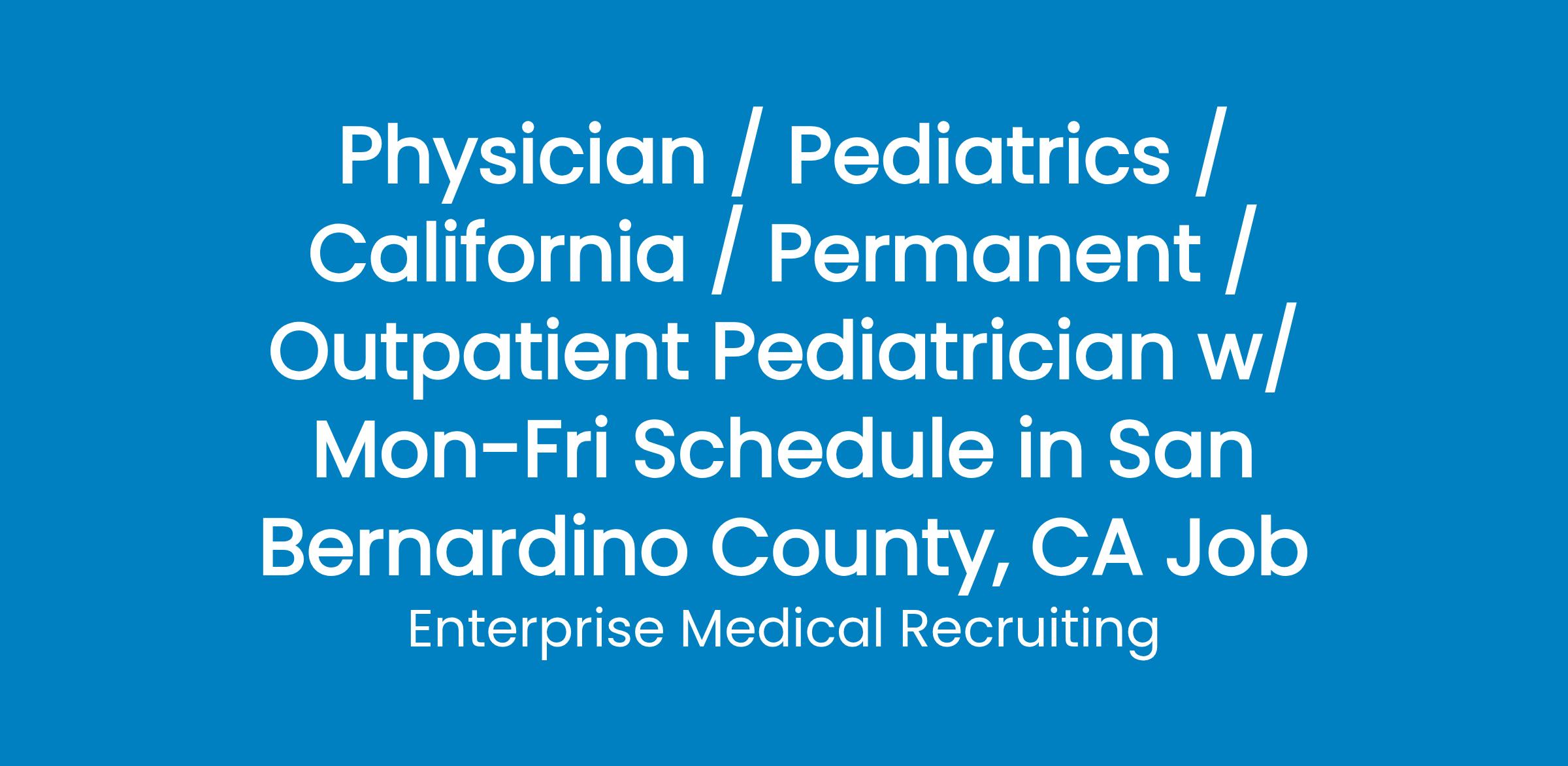 A multispecialty primary care group in San Bernardino County, California is adding a full-time BC/BE pediatrician to their practice. Must be comfortable working independently as you will be the only pediatrician in this clinic.
