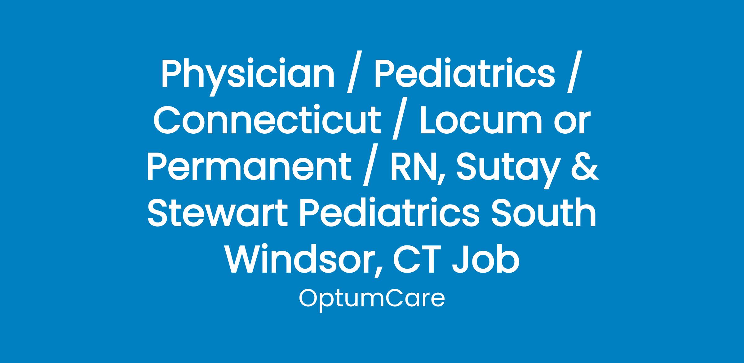 ProHealth Physicians, Sutay & Stewart Pediatrics in South Windsor, has an immediate opening for a friendly, customer focused and detailed oriented RN to join our team. The approximate hours will need to be flexible and range from 8:30am-6:00pm Monday- Friday.