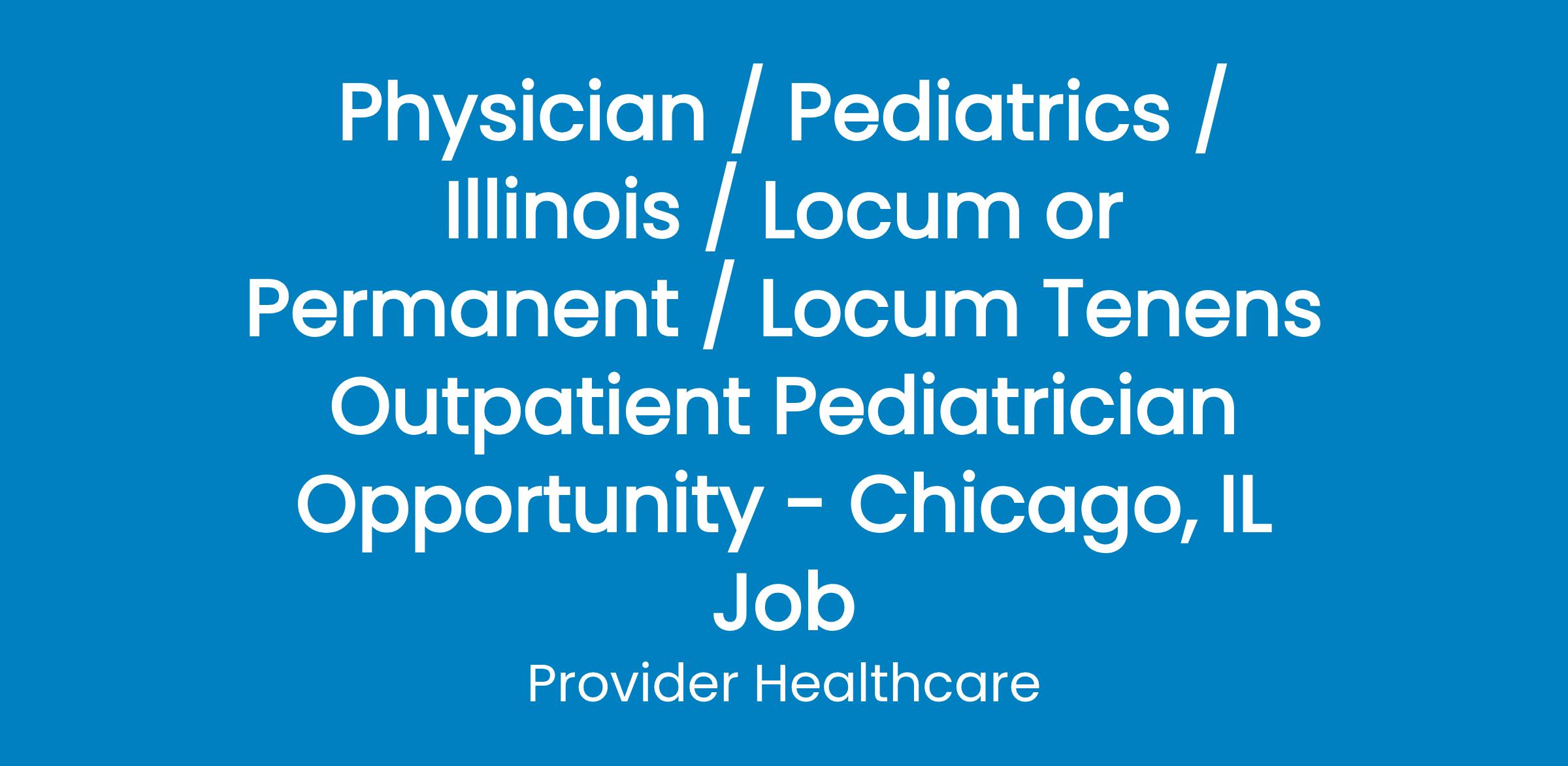 Position: Locum Tenens PediatricianLocation: Chicago, ILDuration: 6-12 month contract (flexible scheduling options)A well-established Federally Qualified Health Center (FQHC), is seeking a Locum Tenens Pediatrician to provide compassionate, high-quality care to underserved pediatric patients in Chicago. This position offers flexible scheduling, competitive pay, and a collaborative clinical environment.