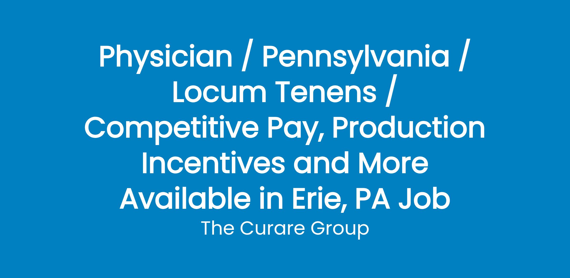 Consider this exceptional opportunity to practice outpatient Neurology in Northwestern Pennsylvania. This is an established, employed Neurology group, with a need for a General Board Certified/Board Eligible Neurologist. Hospital Employee, Outpatient only. Competitive Salary OR Income Guarantee. WRVU production incentives. Signing Bonus available, contact us for details. Relocation Bonus available. CME time and money available. 403B.