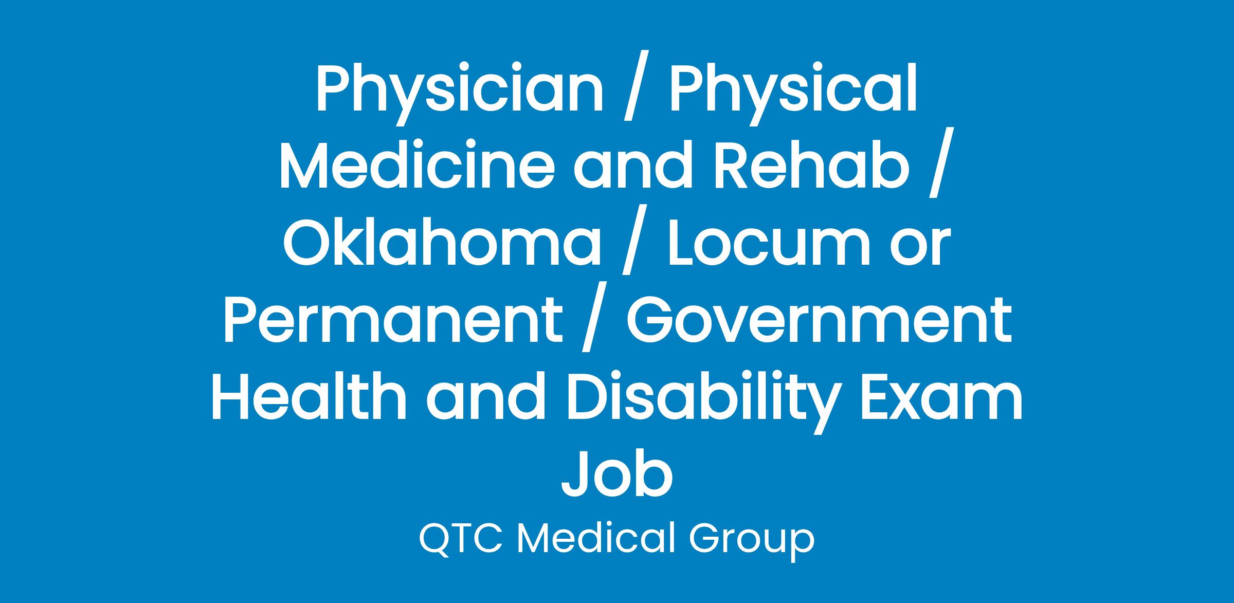 Physician / Physical Medicine and Rehab / Oklahoma / Locum or Permanent / Government Health and Disability Exam Job