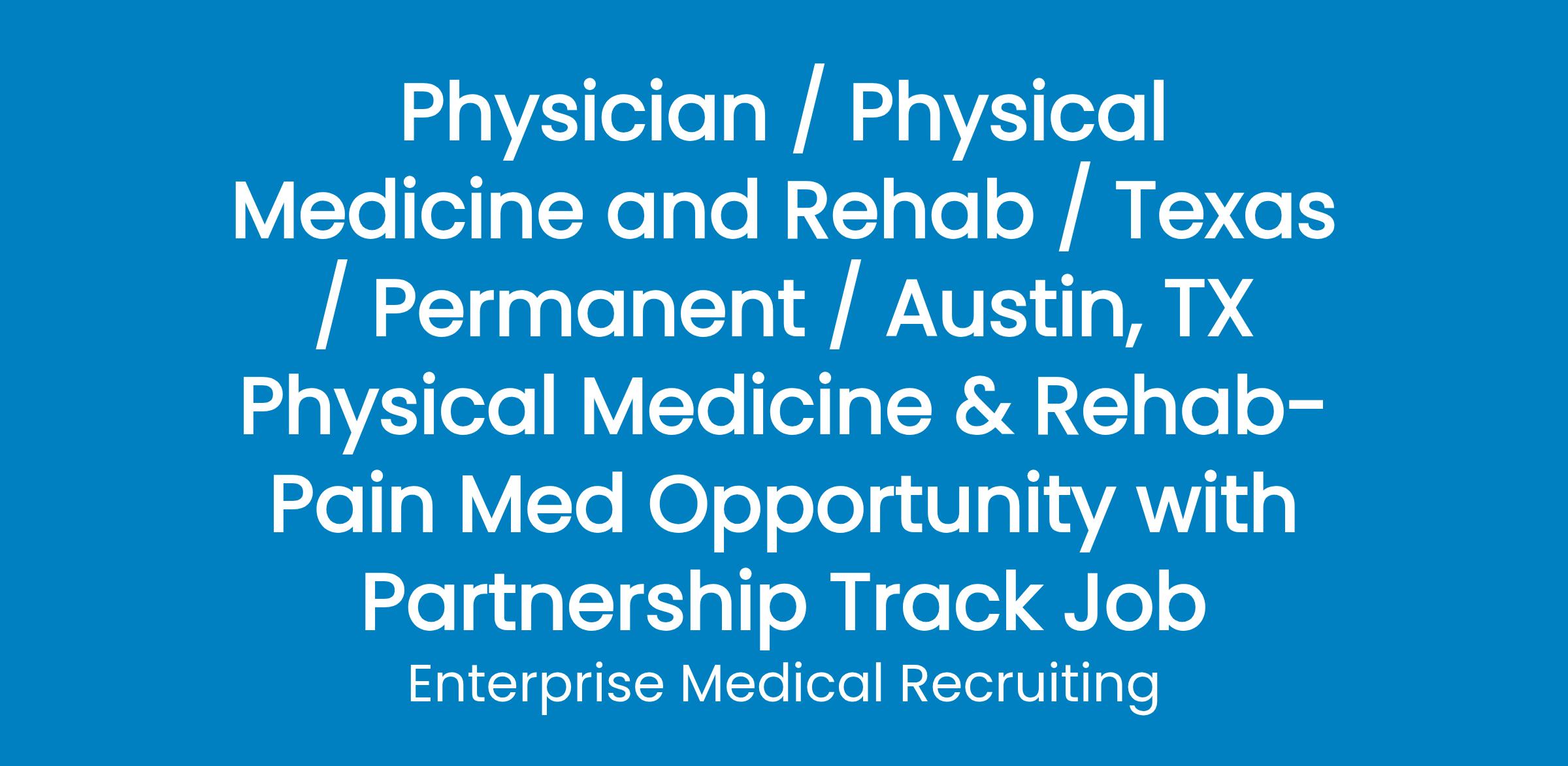 Enterprise Medical Recruiting assists a well-established Austin, Texas practice in hiring a new Physical Medicine & Rehab-Pain physician. The group currently has 4 Pain providers, 1 PA, and 3 Physical Therapists.
