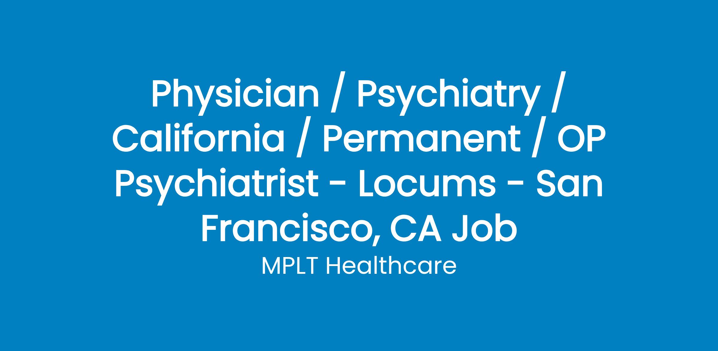 MPLT Healthcare is looking for physicians who Understand the Urgency, Never Give Up, and Have the Courage to Excel in the forever changing medical industry! We have numerous opportunities for an experienced Outpatient Psychiatrist with highly competitive pay rates in San Francisco, CA.