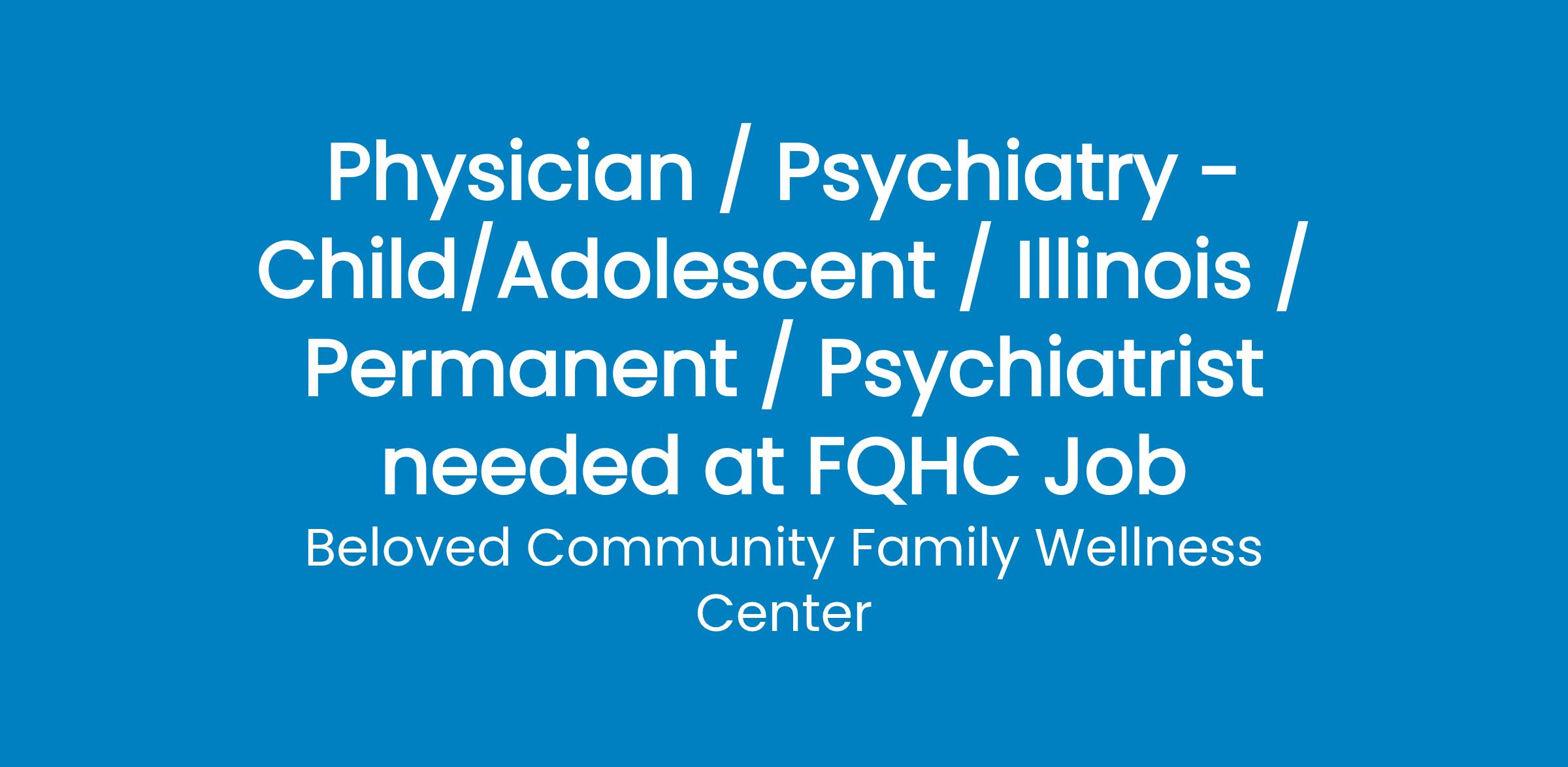 A Federally Qualified Health Center (FQHC) is seeking a part-time licensed psychiatrist to work in a Community Health Center setting. Must be Board certified in child/adult psychiatry. Responsible for attending to patients in a co-located FQHC multidisciplinary outpatient and inpatient setting to render diagnostic, therapeutic, and medical as part of the Primary care/Behavioral Integrated Program Team. Responsibilities will also include initial evaluation of new/established patients, medication management, continued stay reviews, family meetings, and treatment/discharge planning. Working hours: 5 hours once a week.